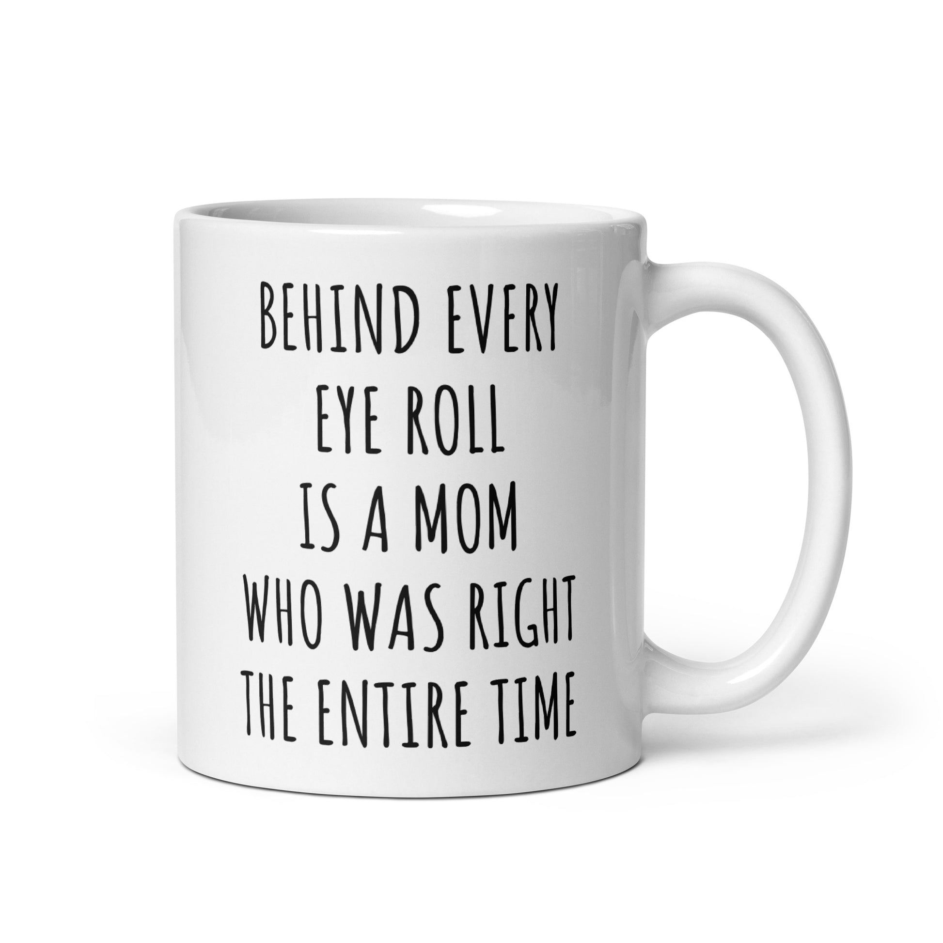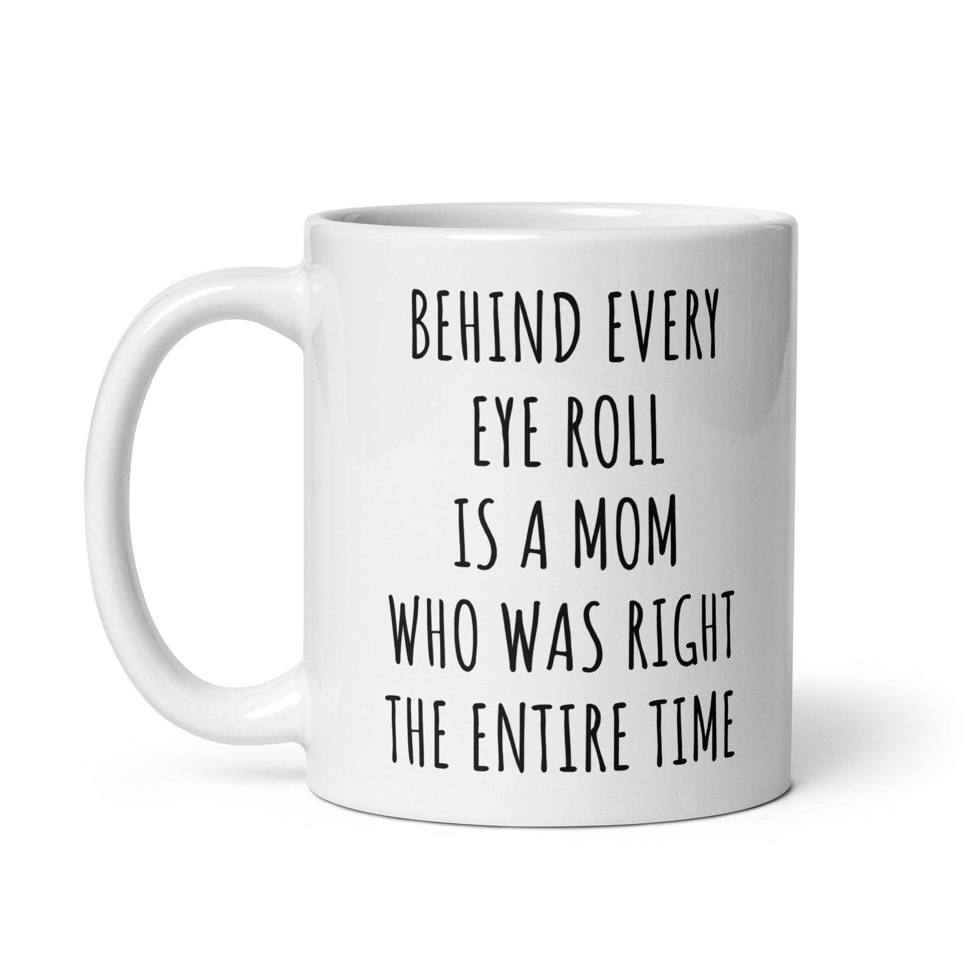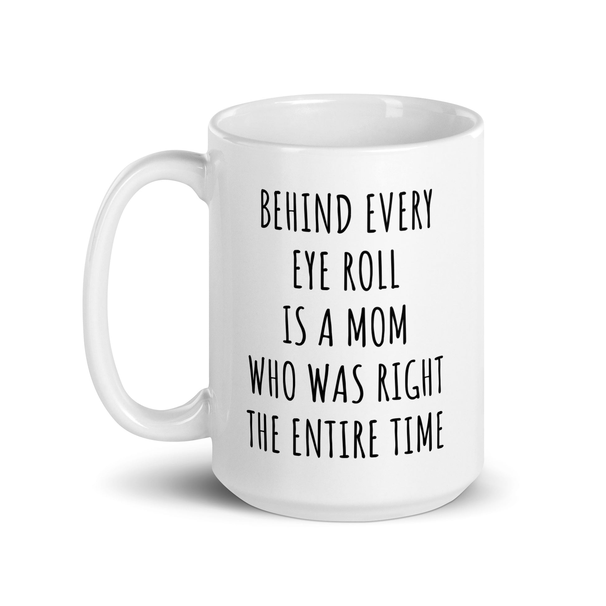 “Behind Every Eye Roll Is A Mom Who Was Right The Entire Time" coffee mug in white.