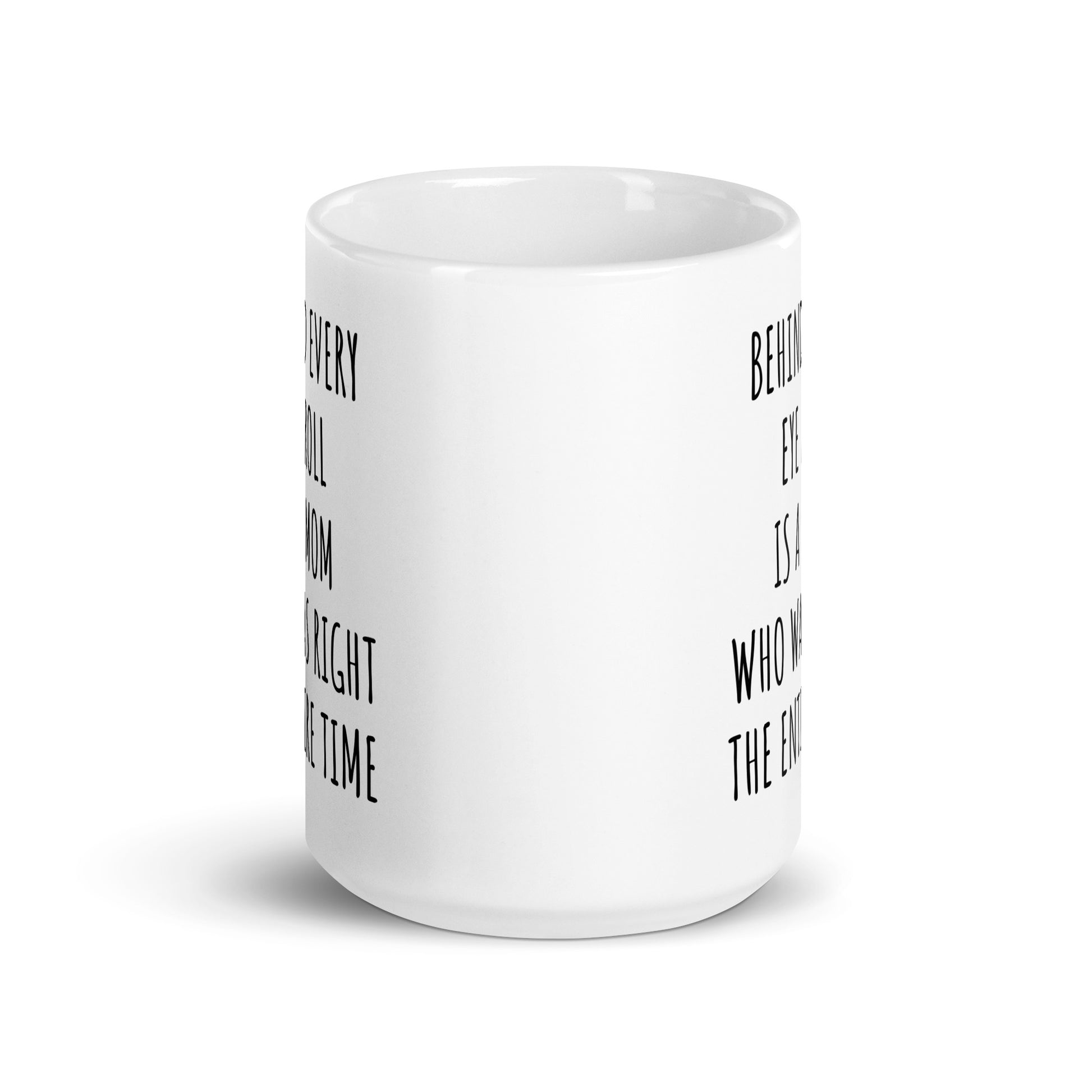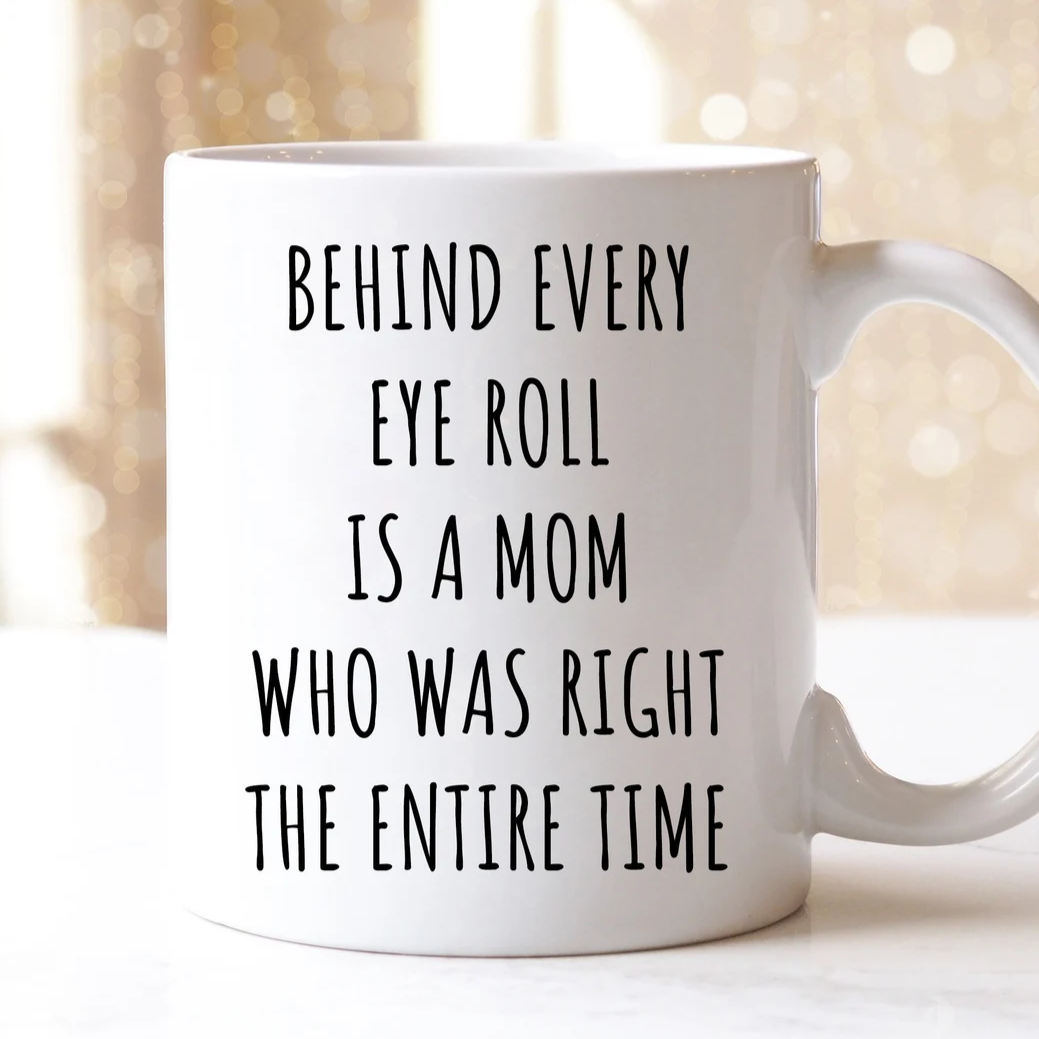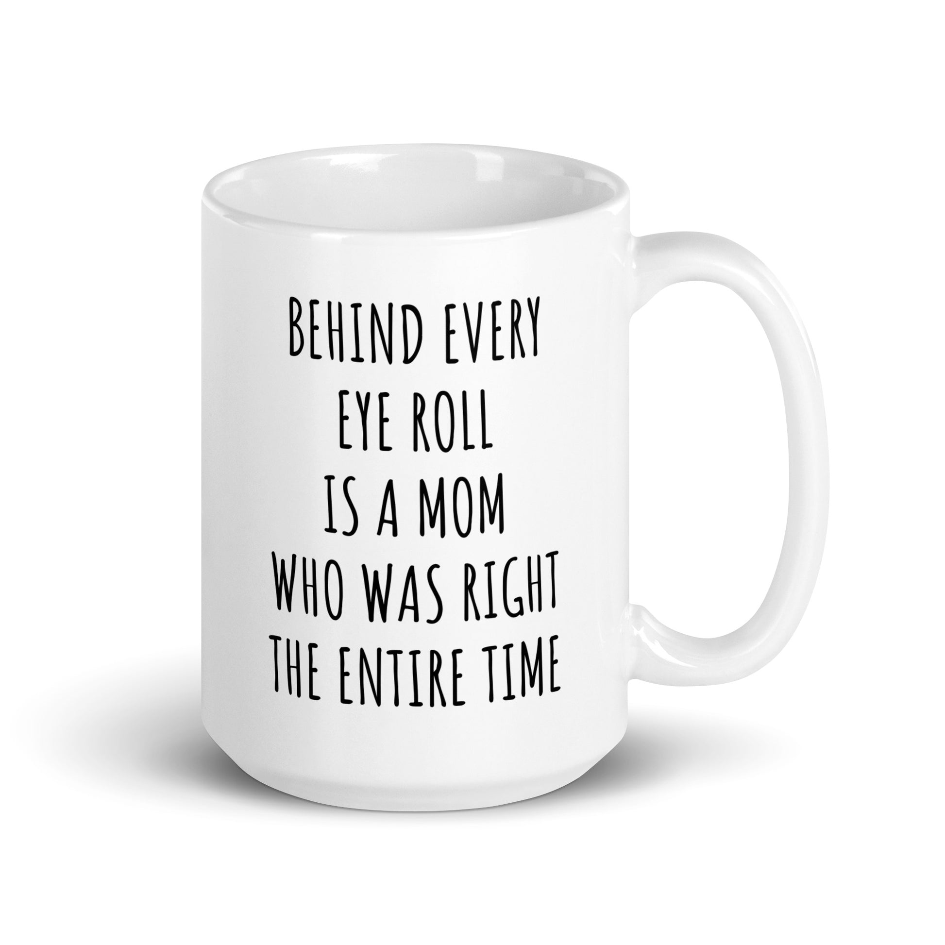 “Behind Every Eye Roll Is A Mom Who Was Right The Entire Time" coffee mug in white.