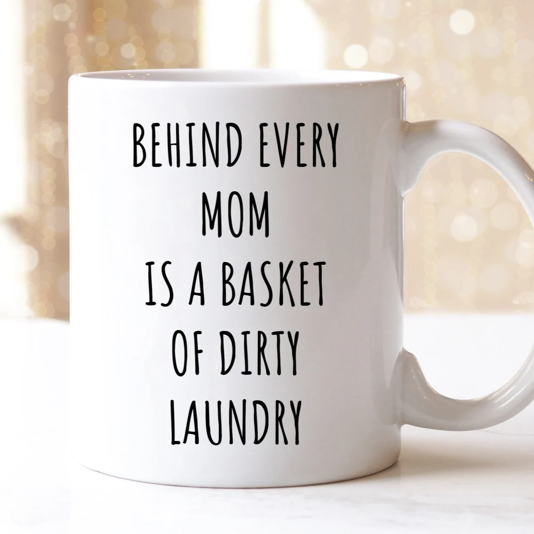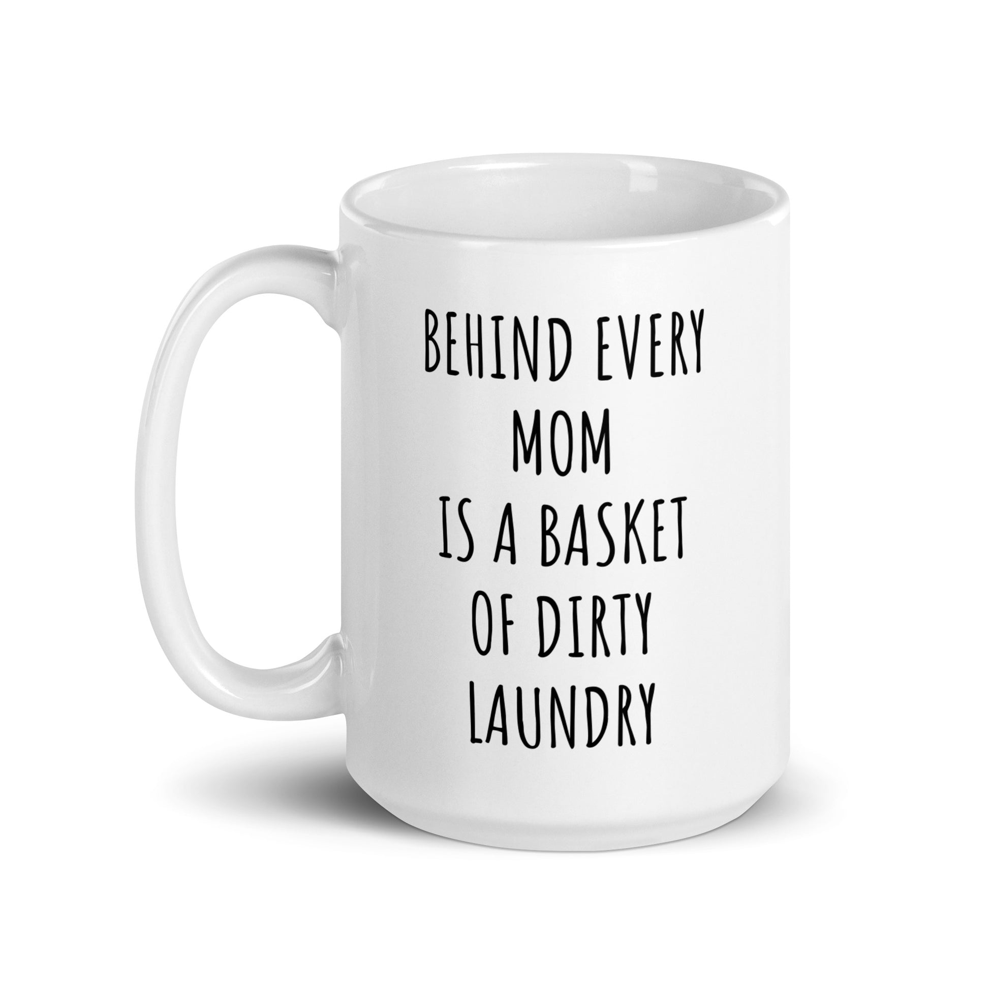 “Behind Every Mom Is A Basket Of Dirty Laundry" coffee mug in white.