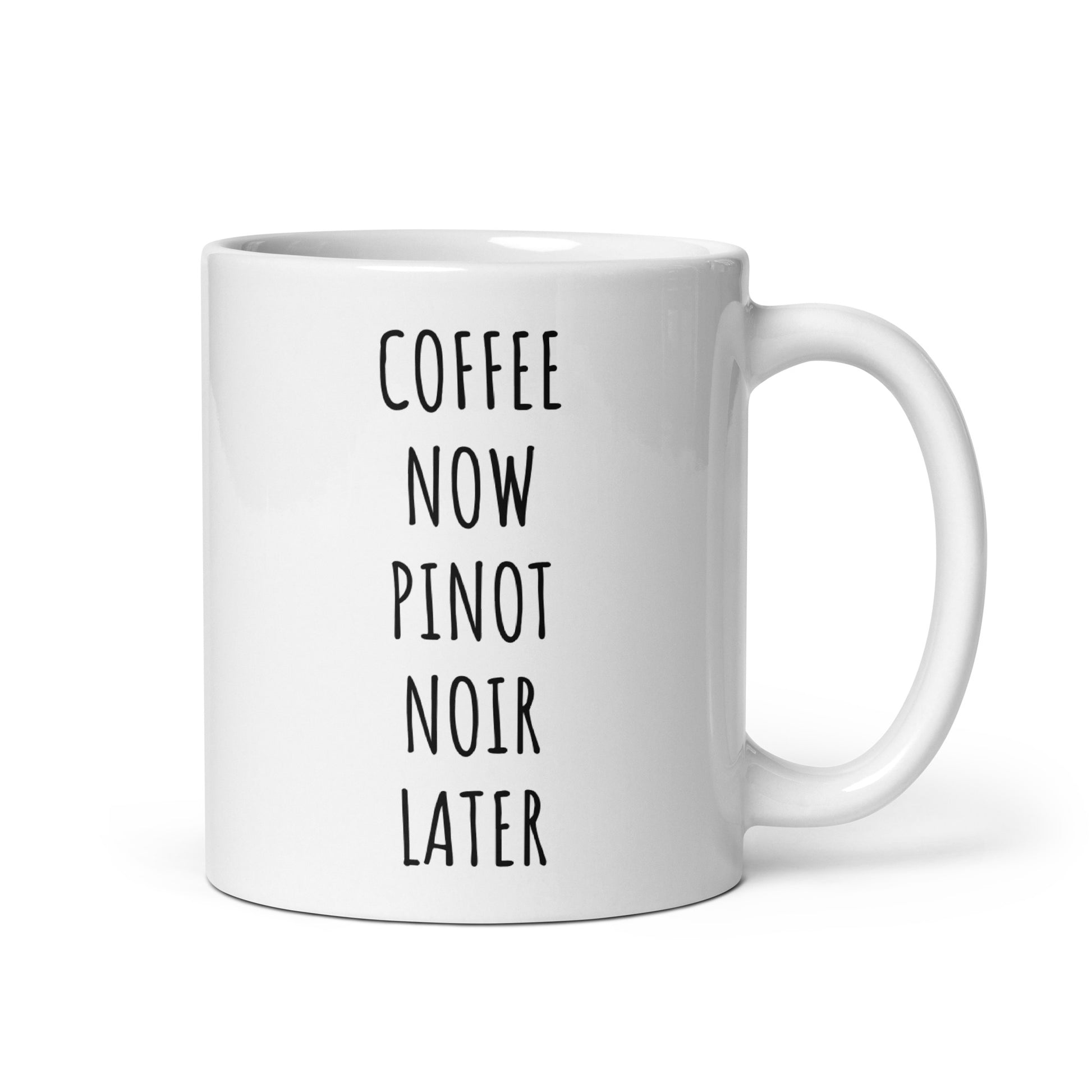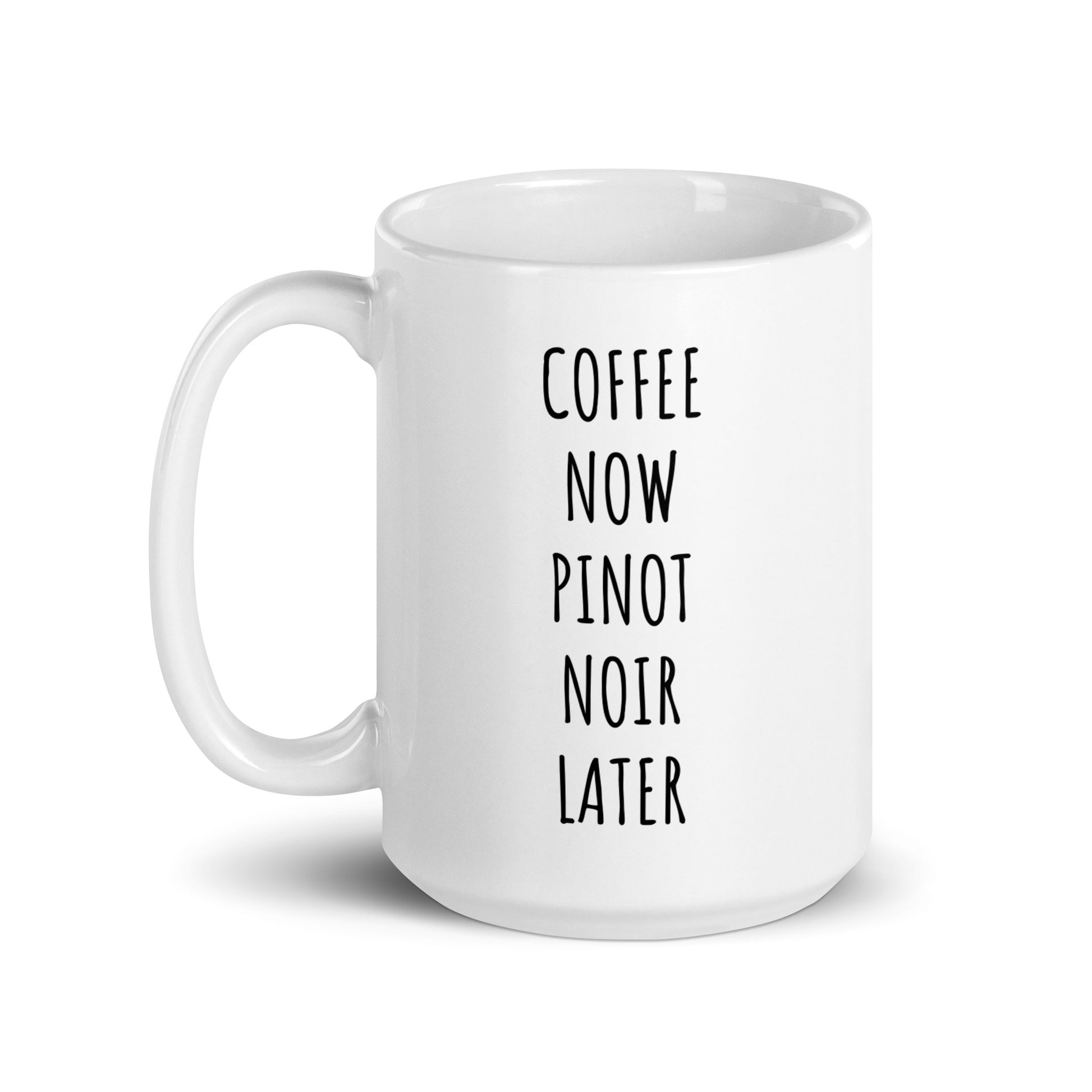 “Coffee Now Pinot Noir Later" coffee mug in white.