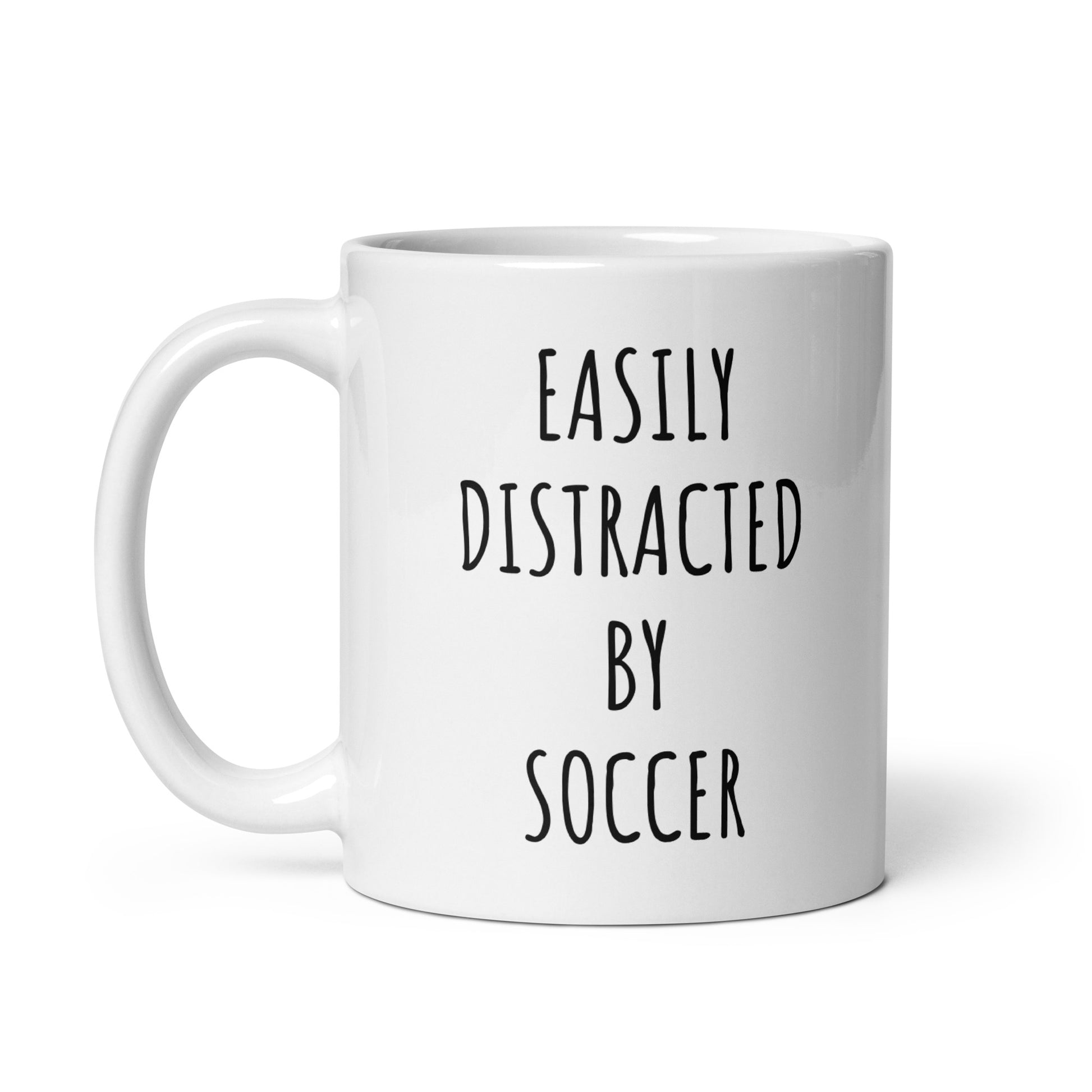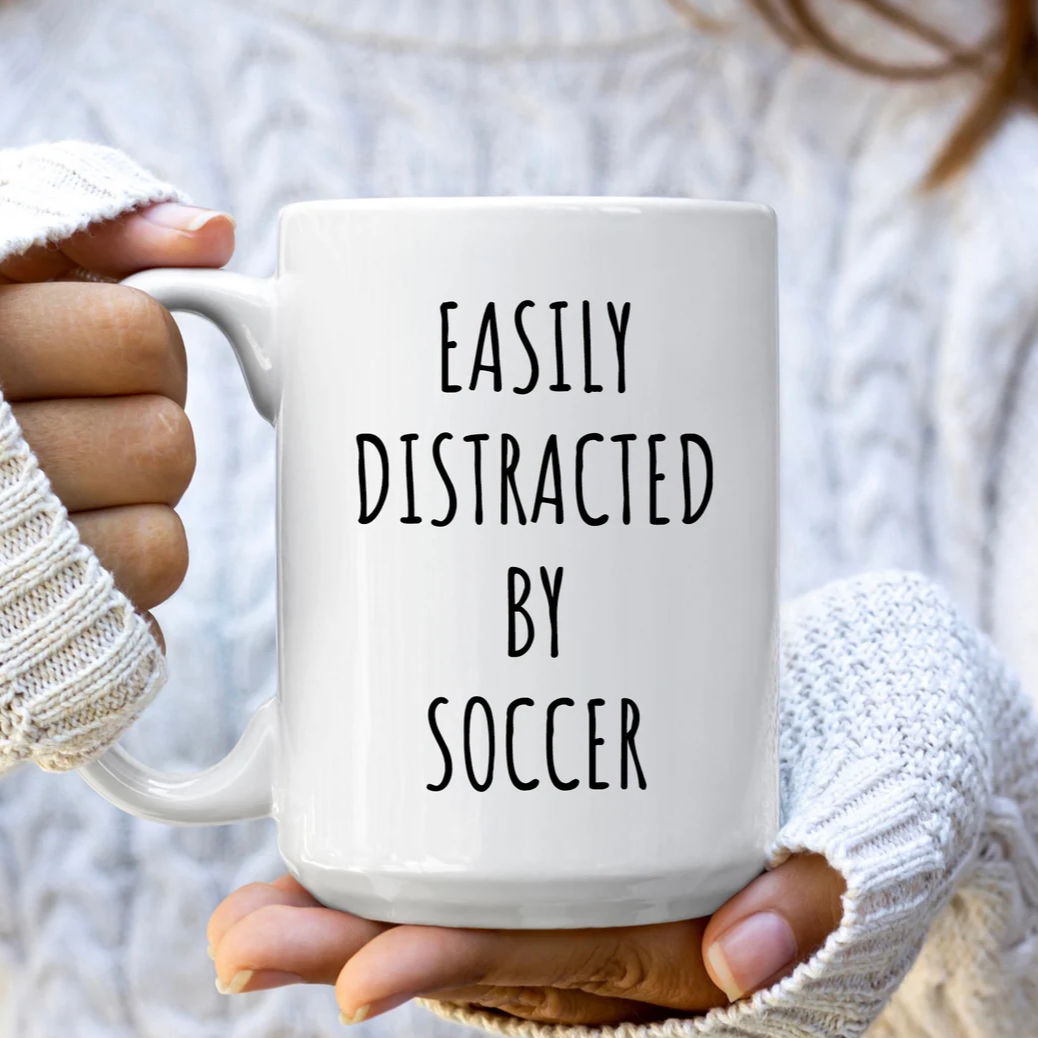 “Easily Distracted By Soccer" coffee mug in white.