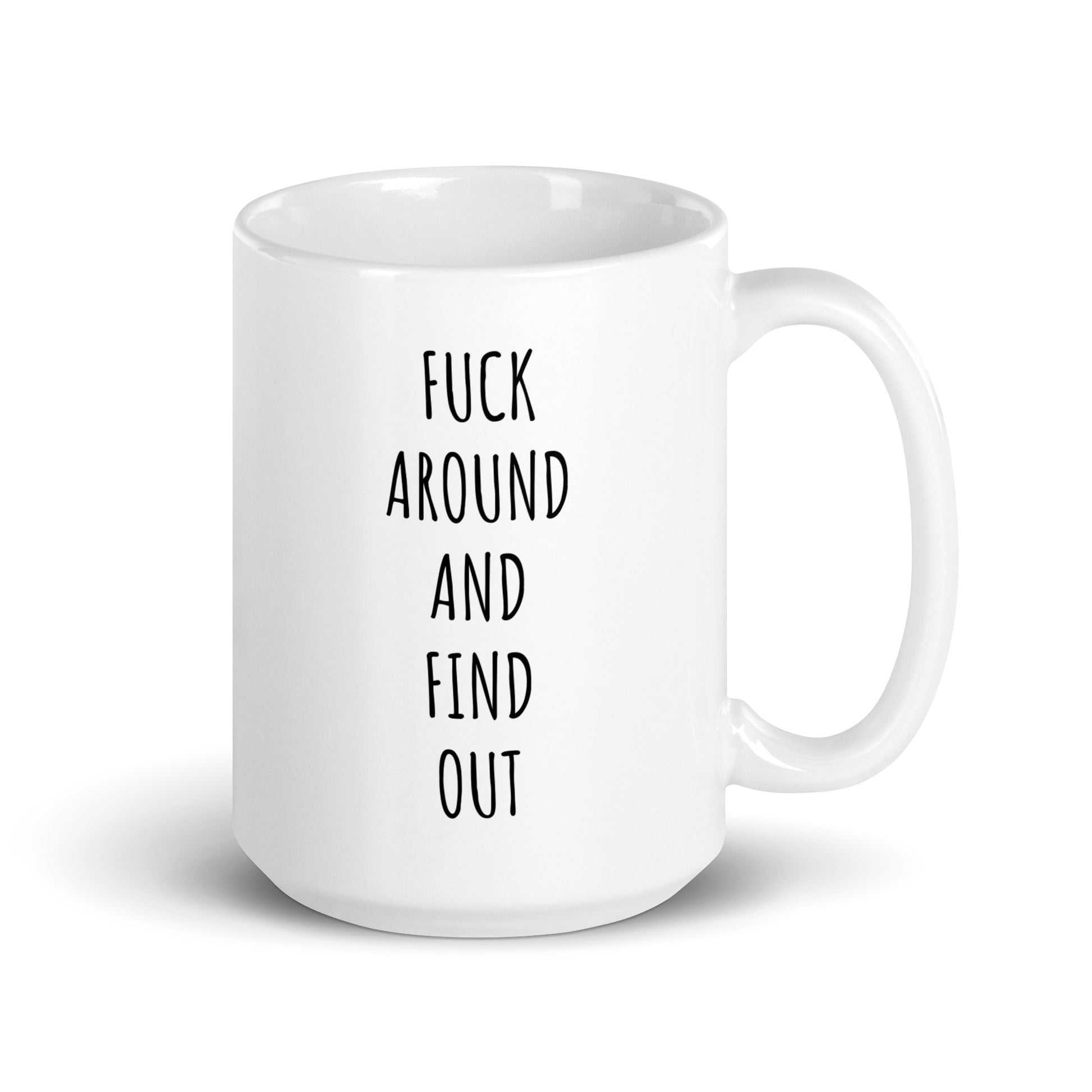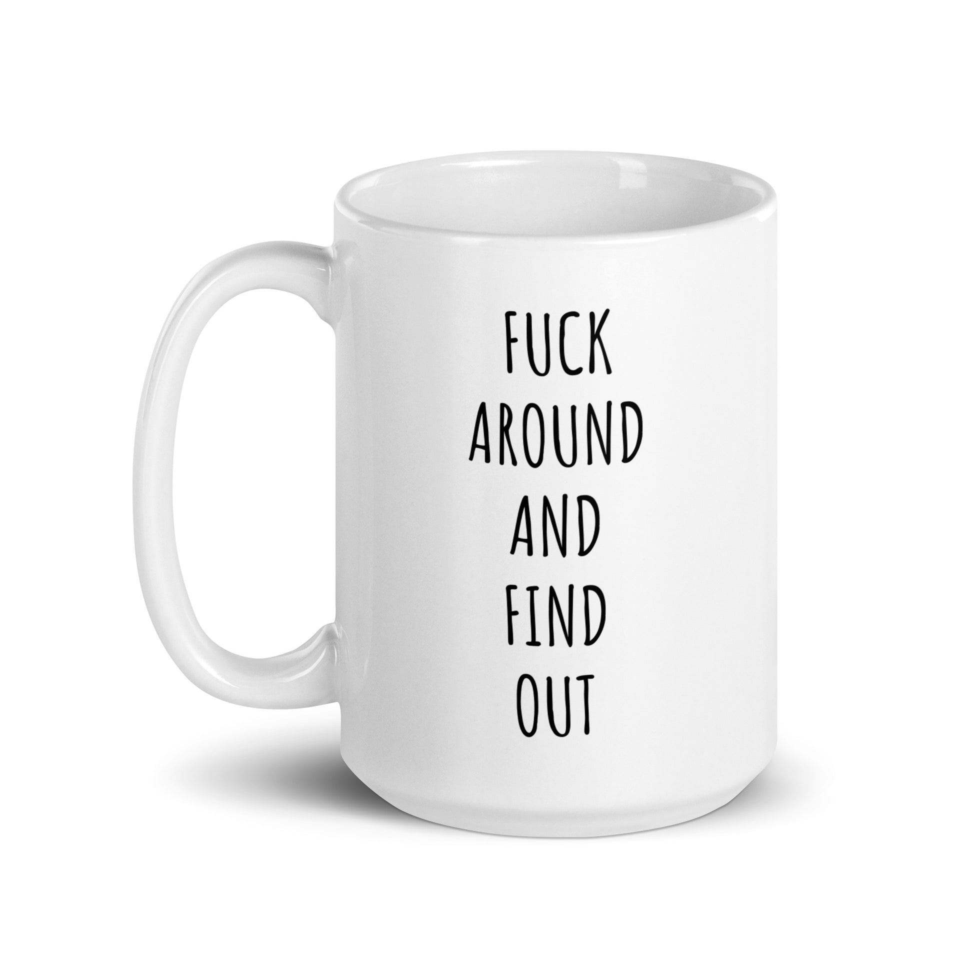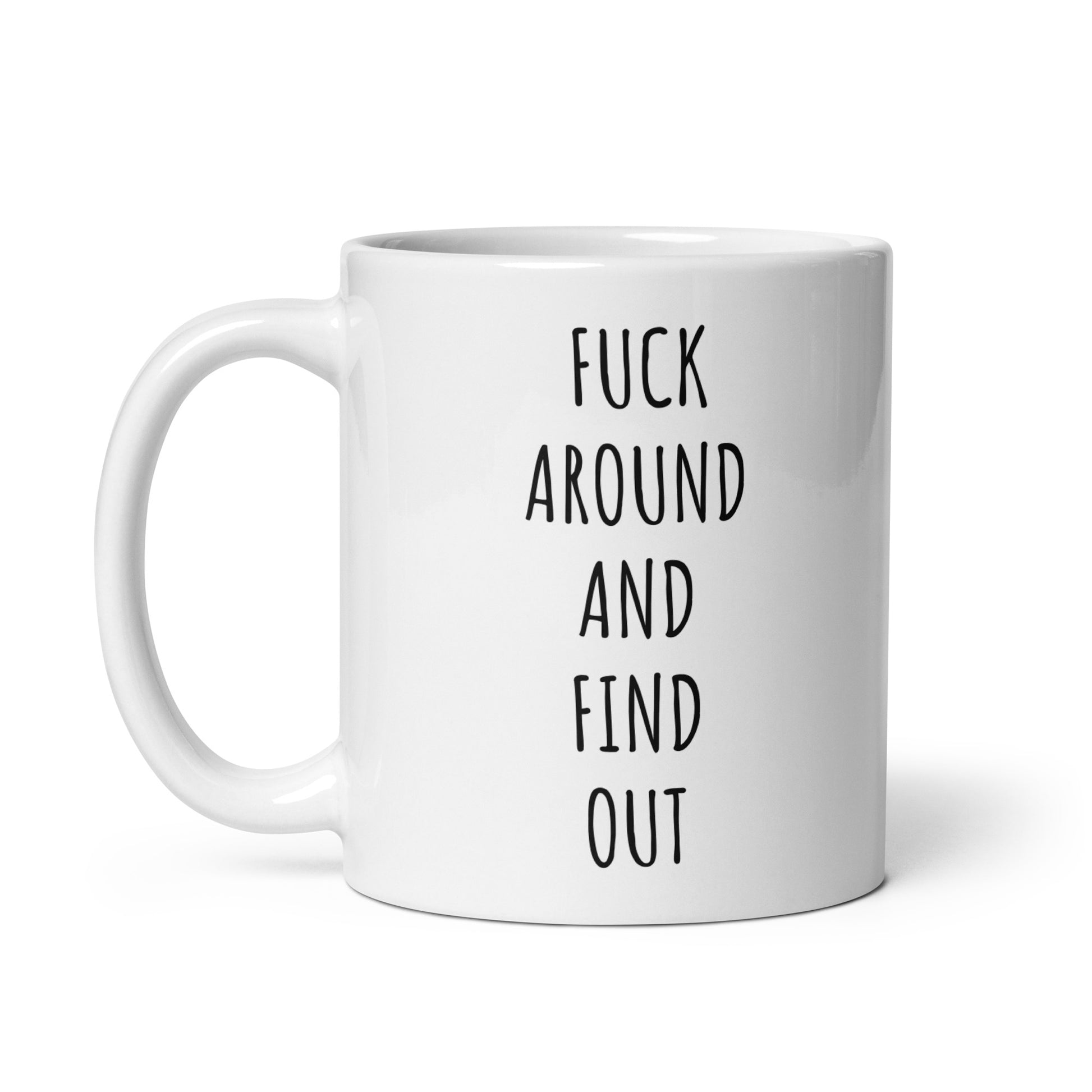 “Fuck Around And Find Out" coffee mug in white.