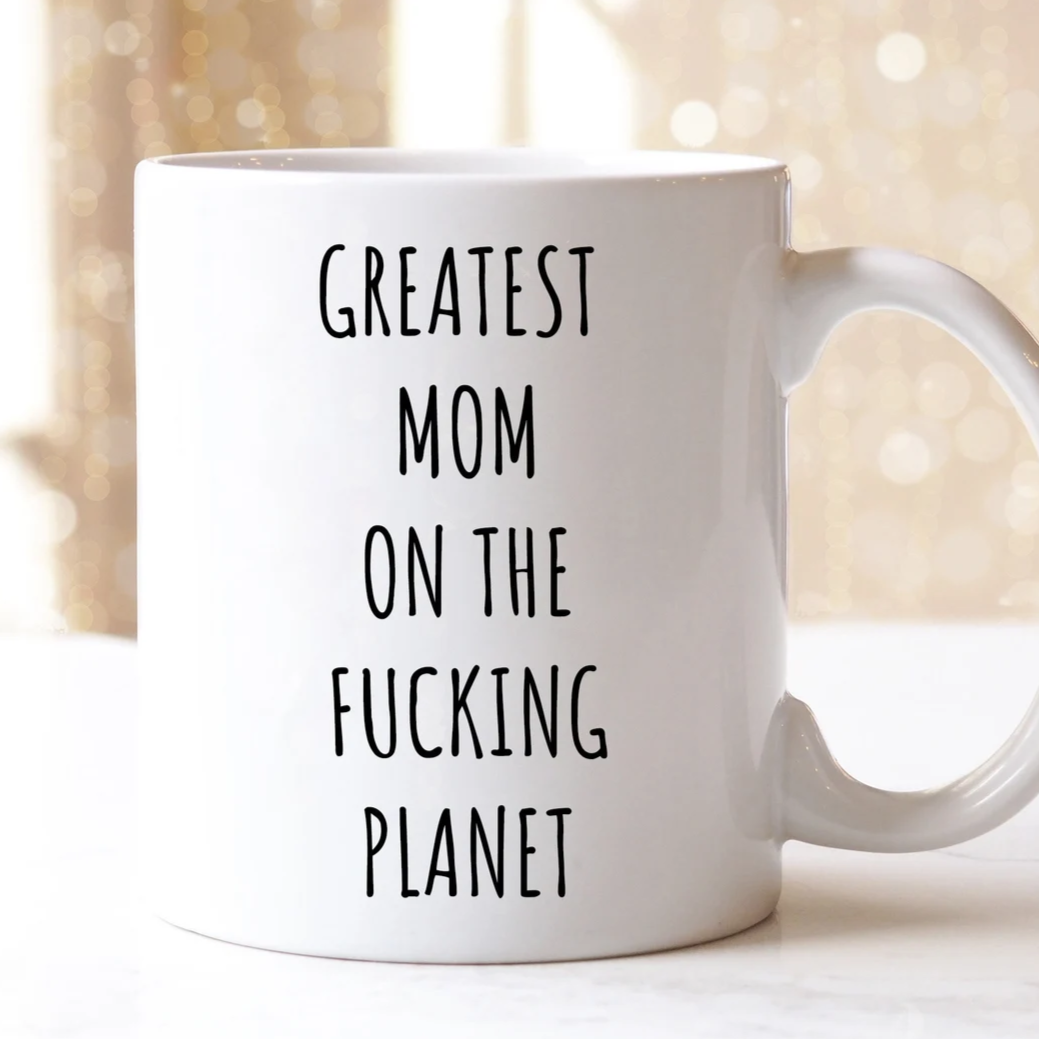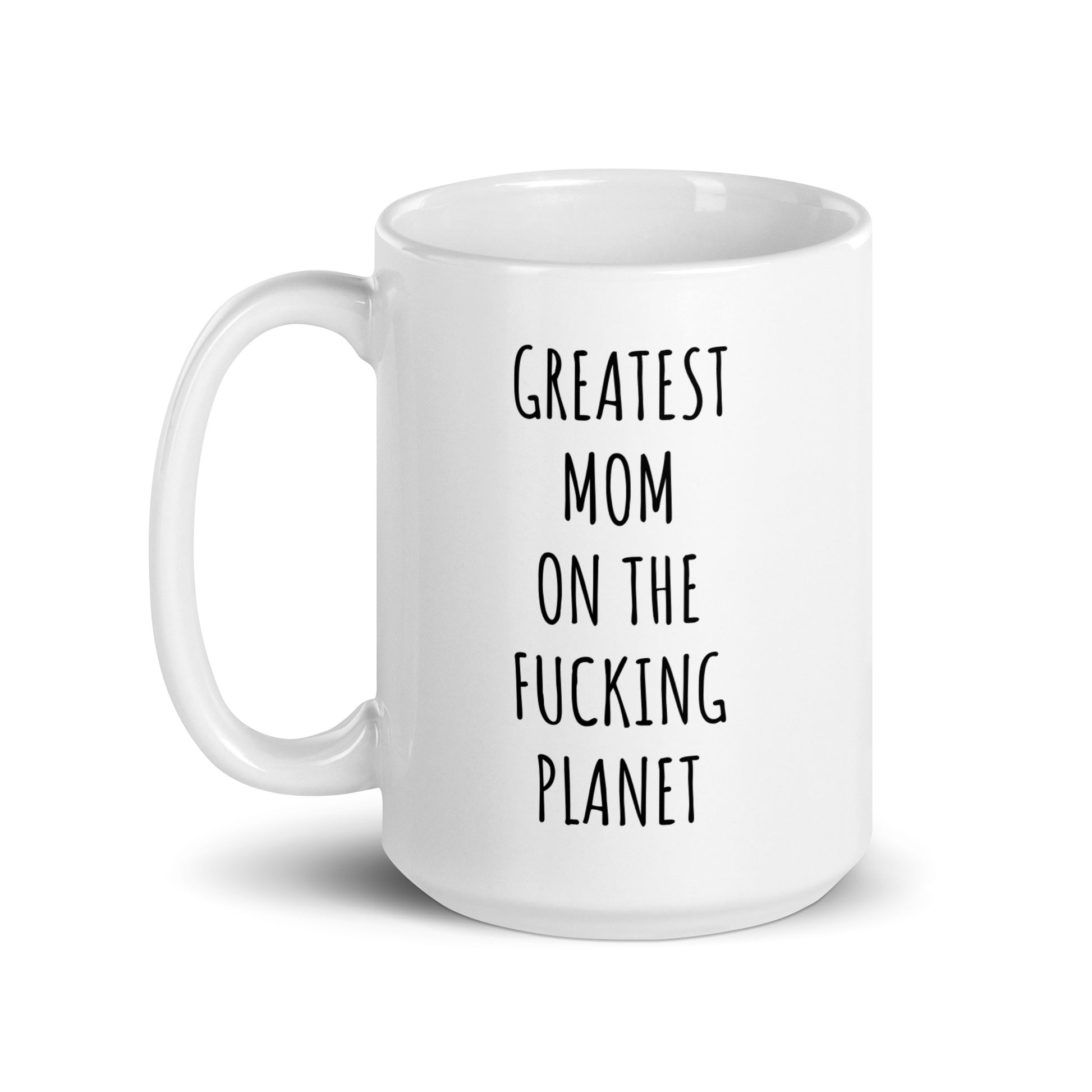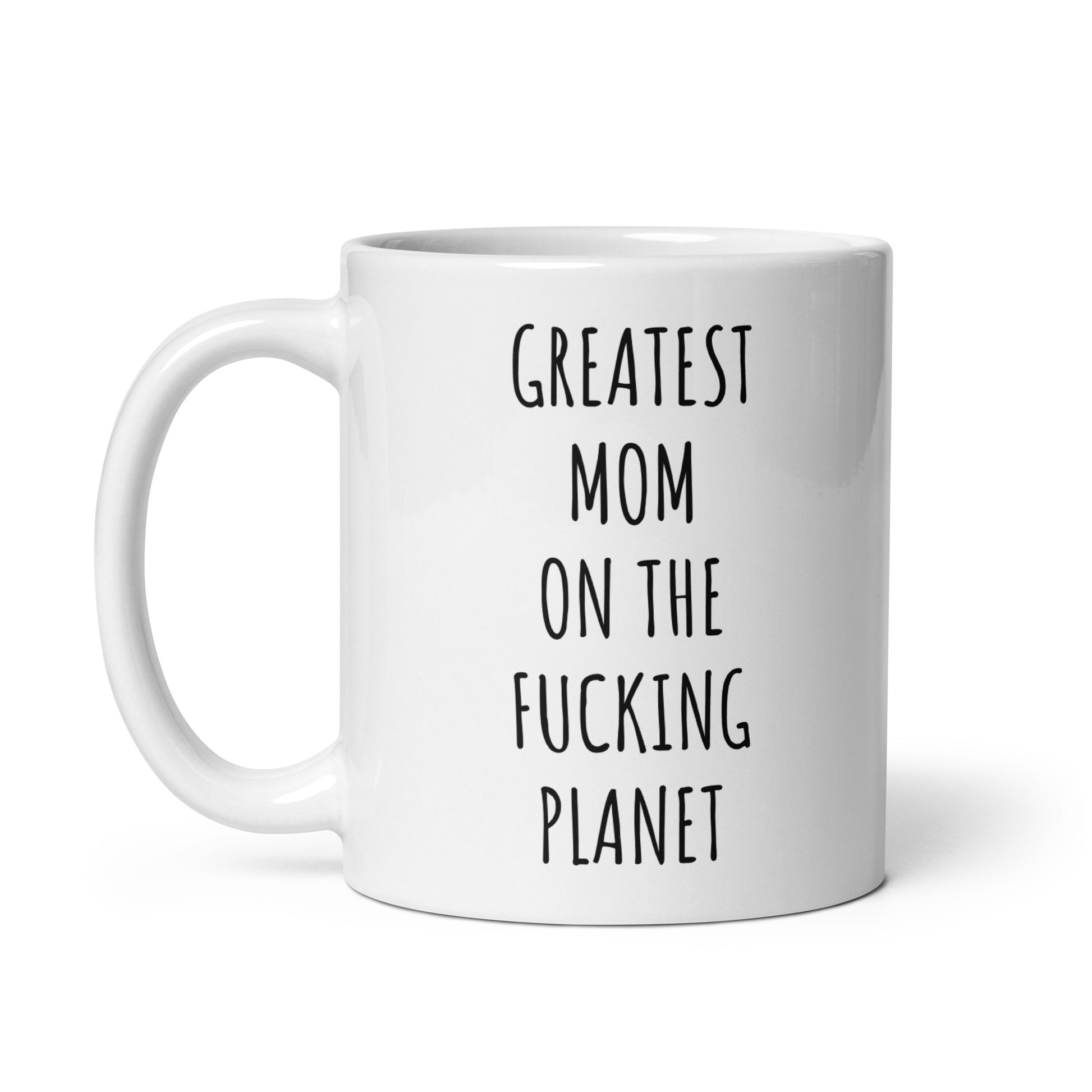 “Greatest Mom On The Fucking Planet" coffee mug in white.