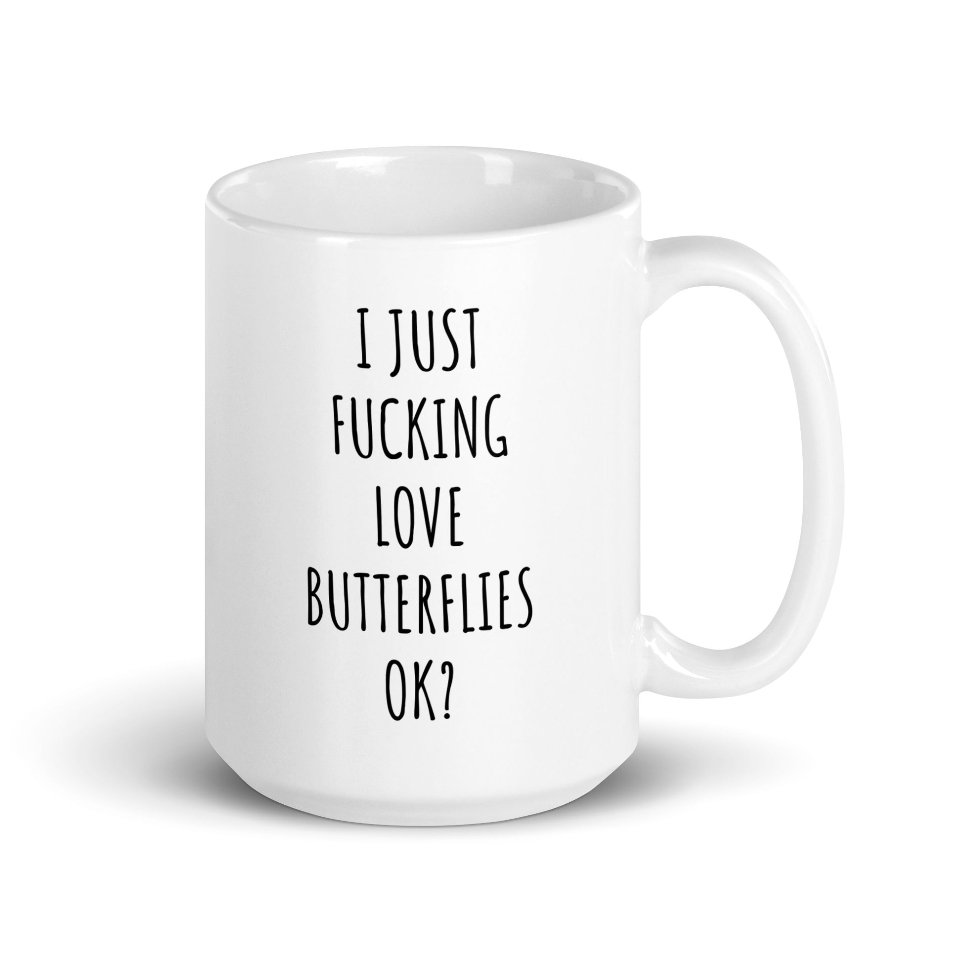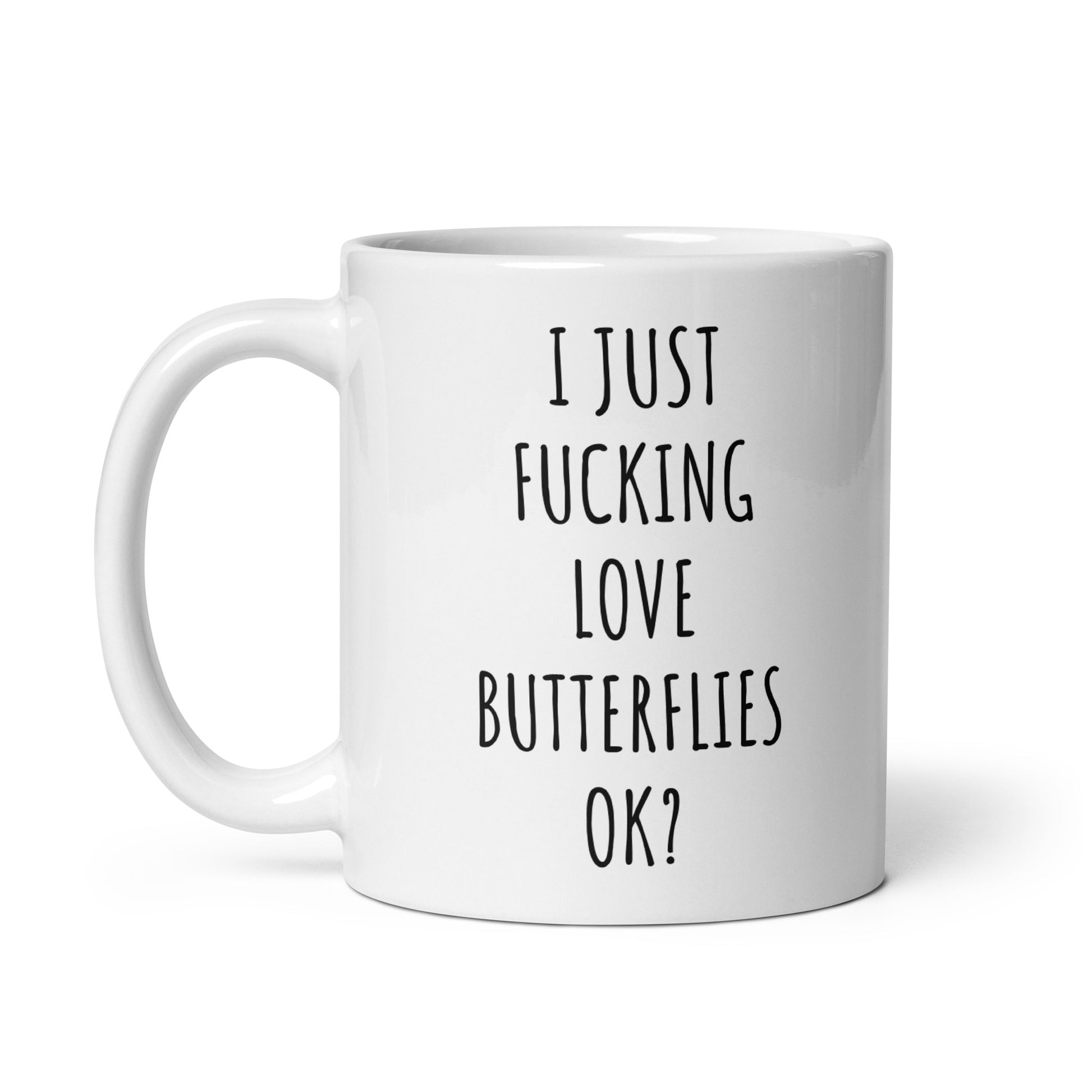 “I Just Fucking Love Butterflies Ok?" coffee mug in white.