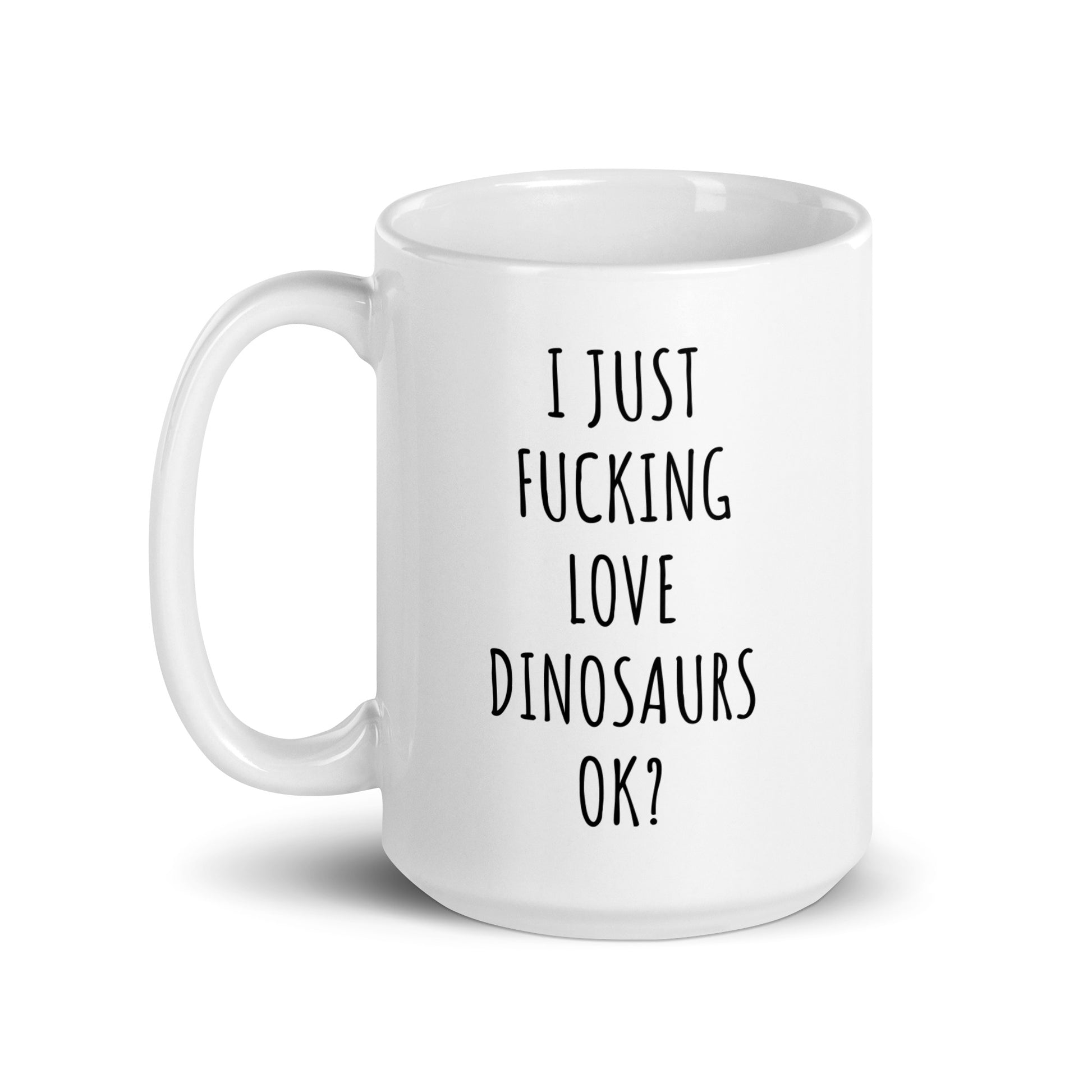 “I Just Fucking Love Dinosaurs Ok?" coffee mug in white.