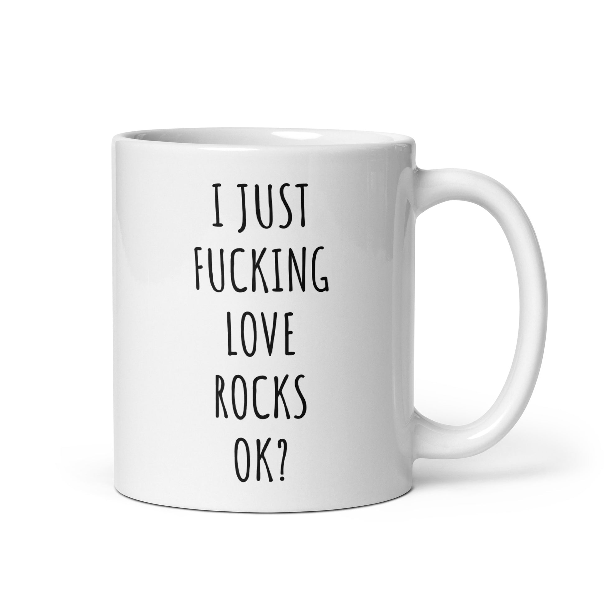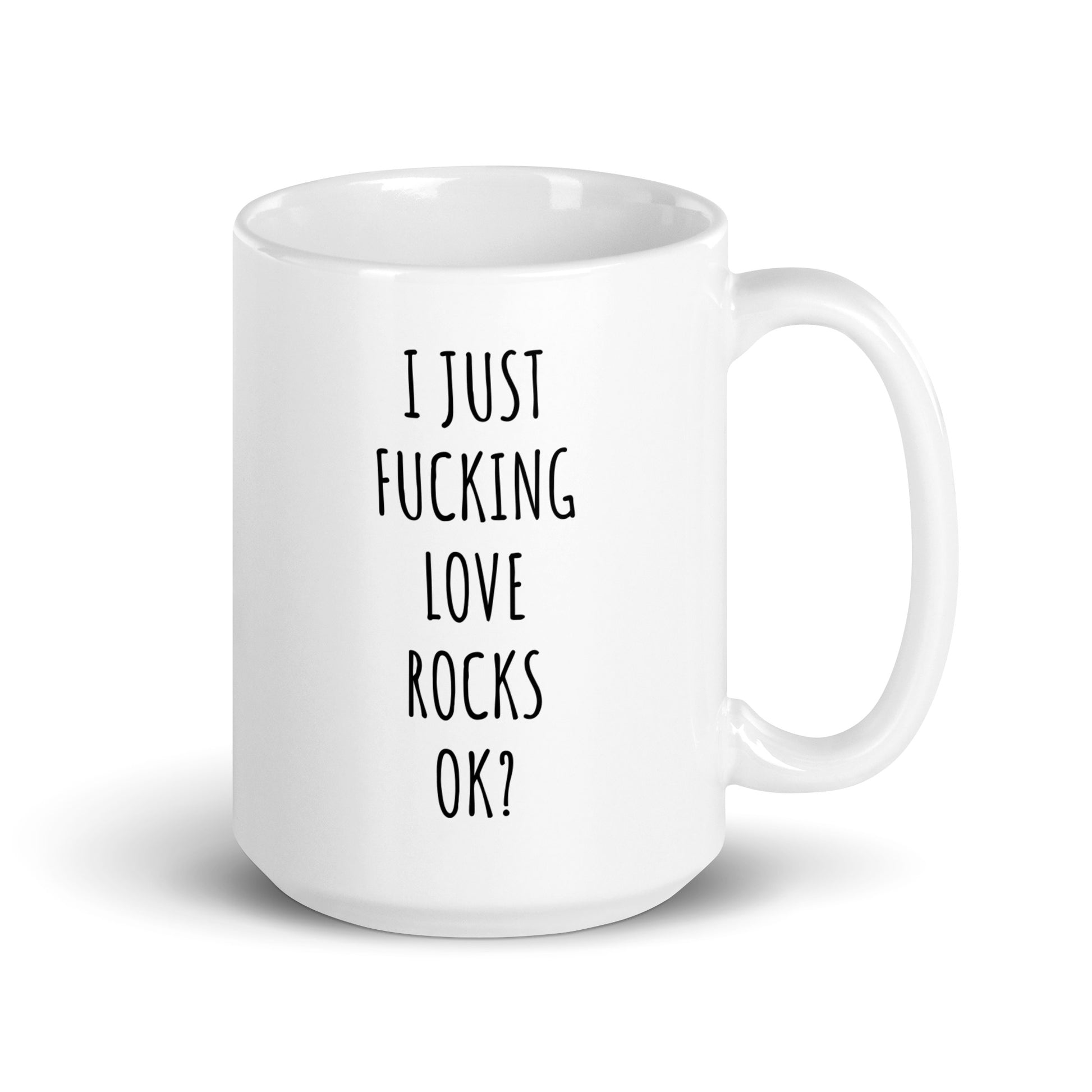 “I Just Fucking Love Rocks Ok?" coffee mug in white.