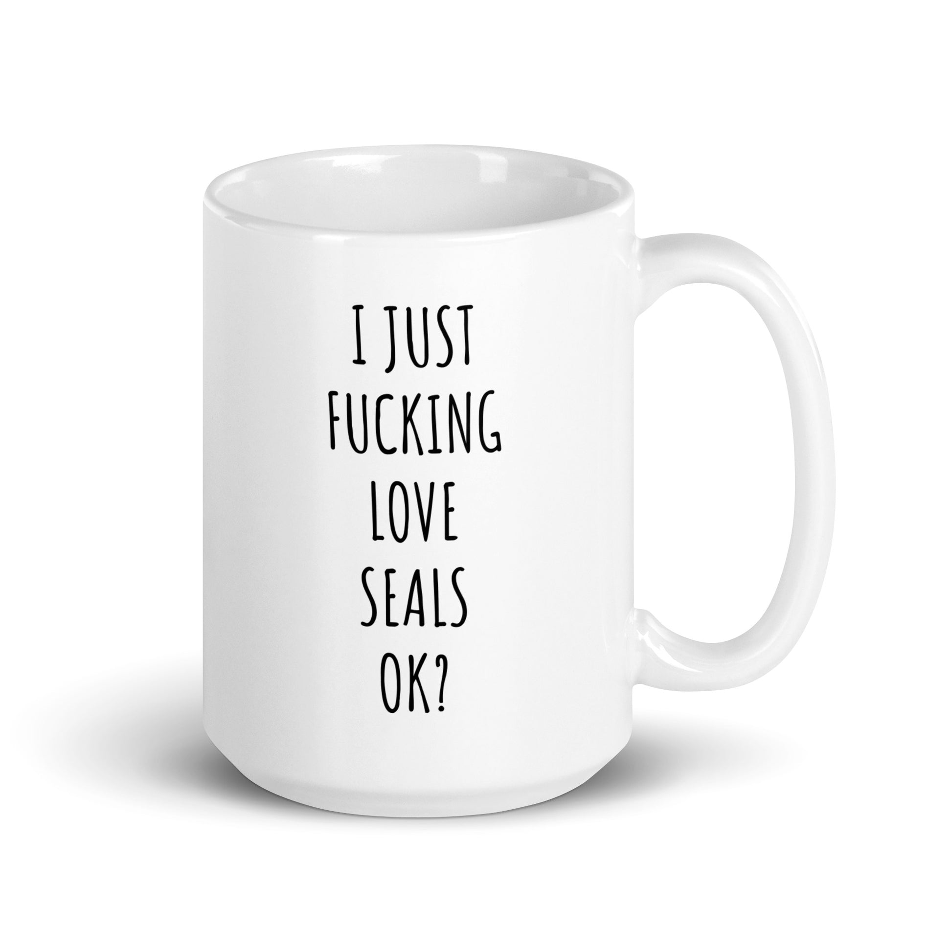 "I Just Fucking Love Seals Ok?" coffee mug in white.