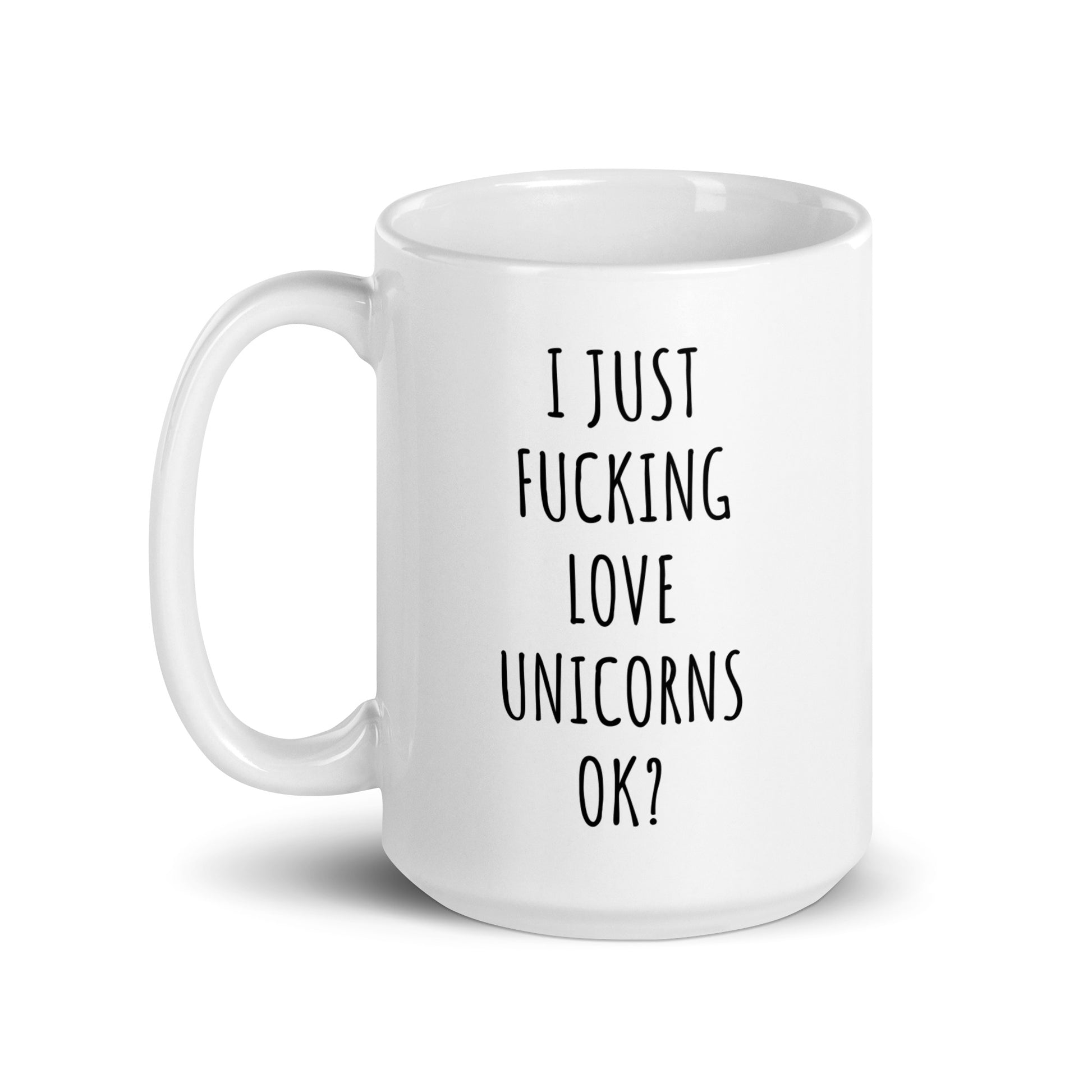 “I Just Fucking Love Unicorns Ok?" coffee mug in white.