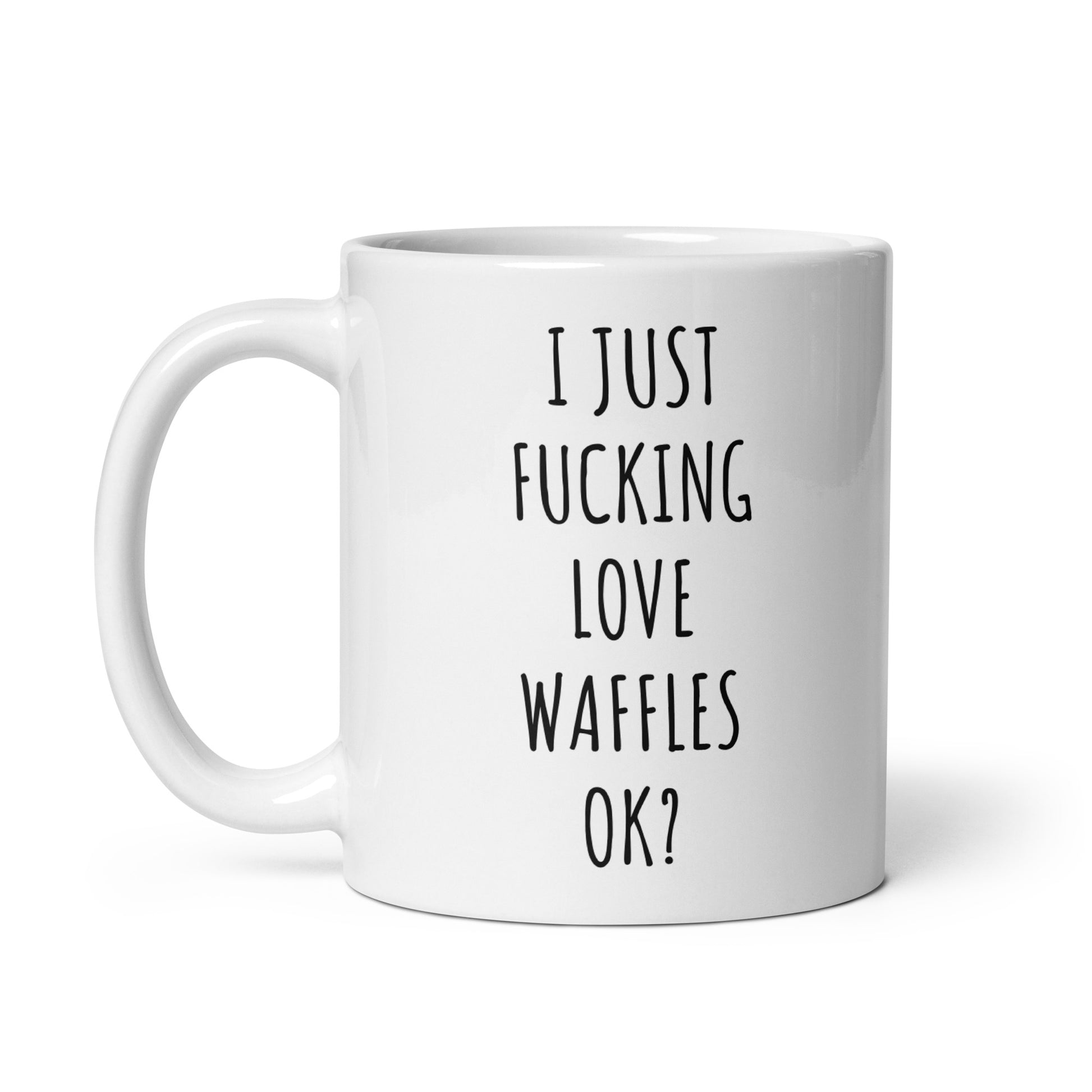 “I Just Fucking Love Waffles Ok?" coffee mug in white.