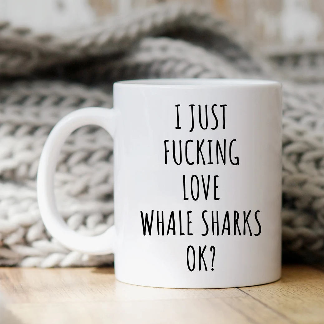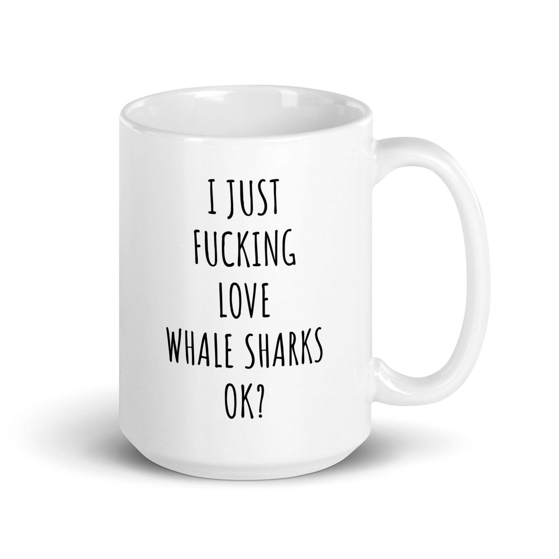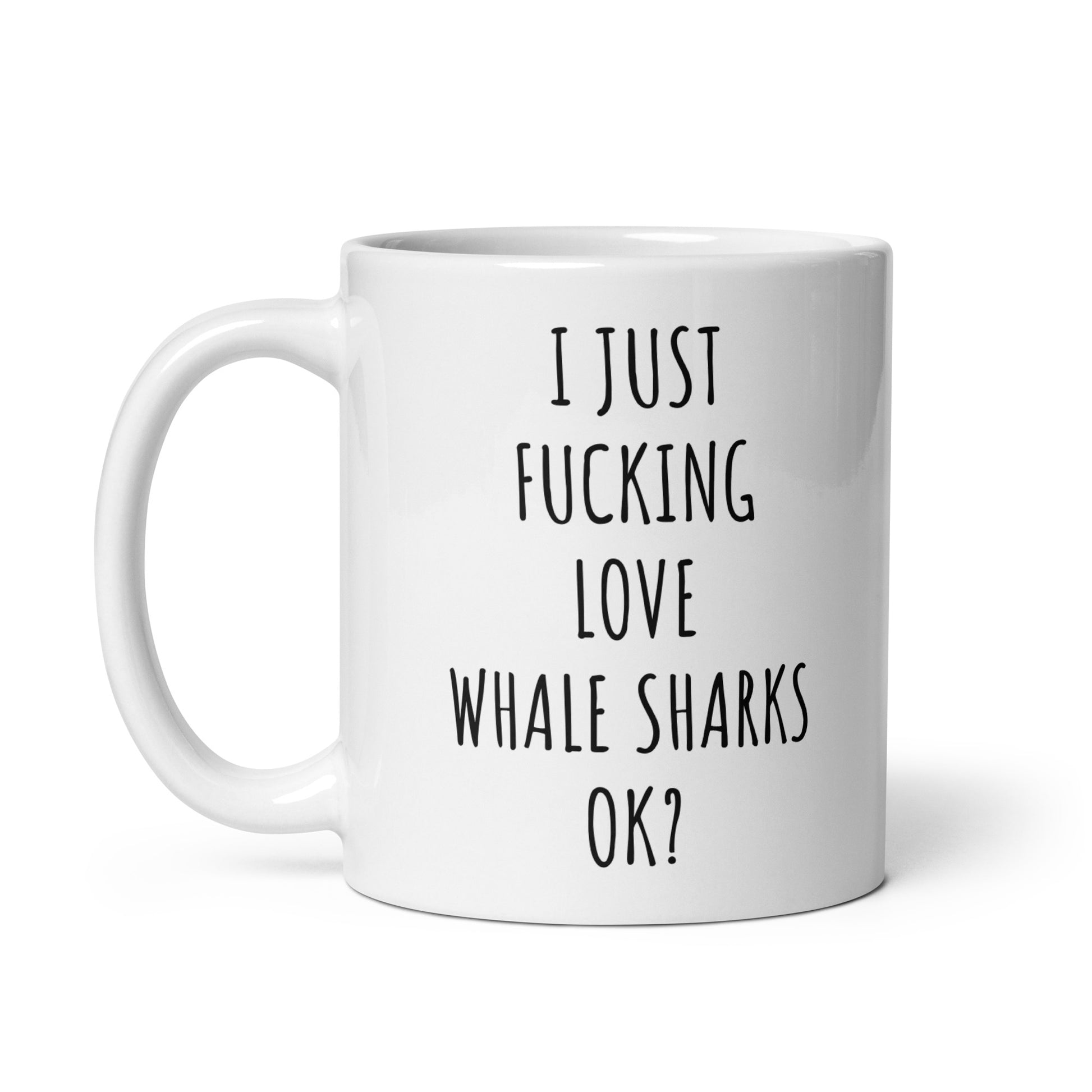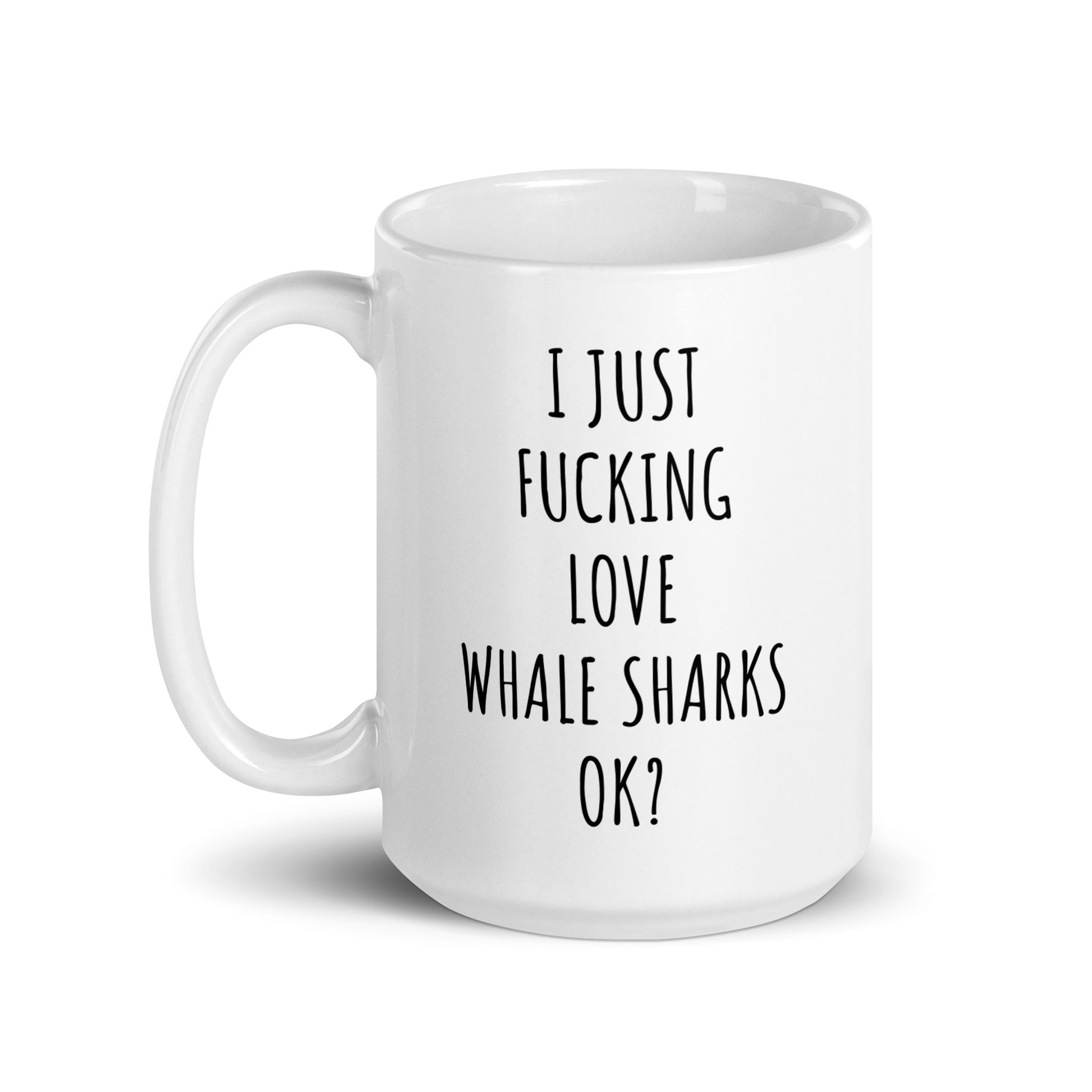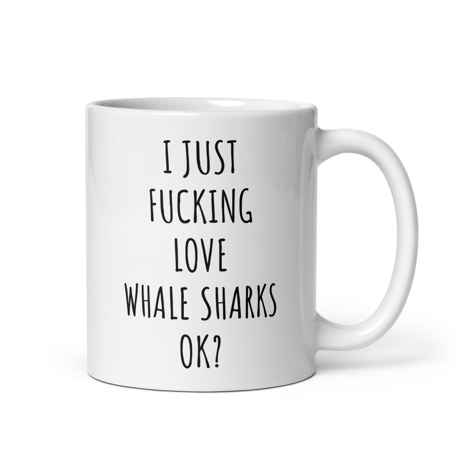 “I Just Fucking Love Whale Sharks Ok?" coffee mug in white.