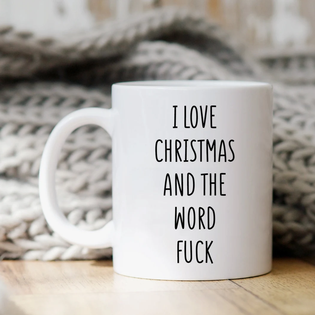 “I Love Christmas And The Word Fuck" coffee mug in white.