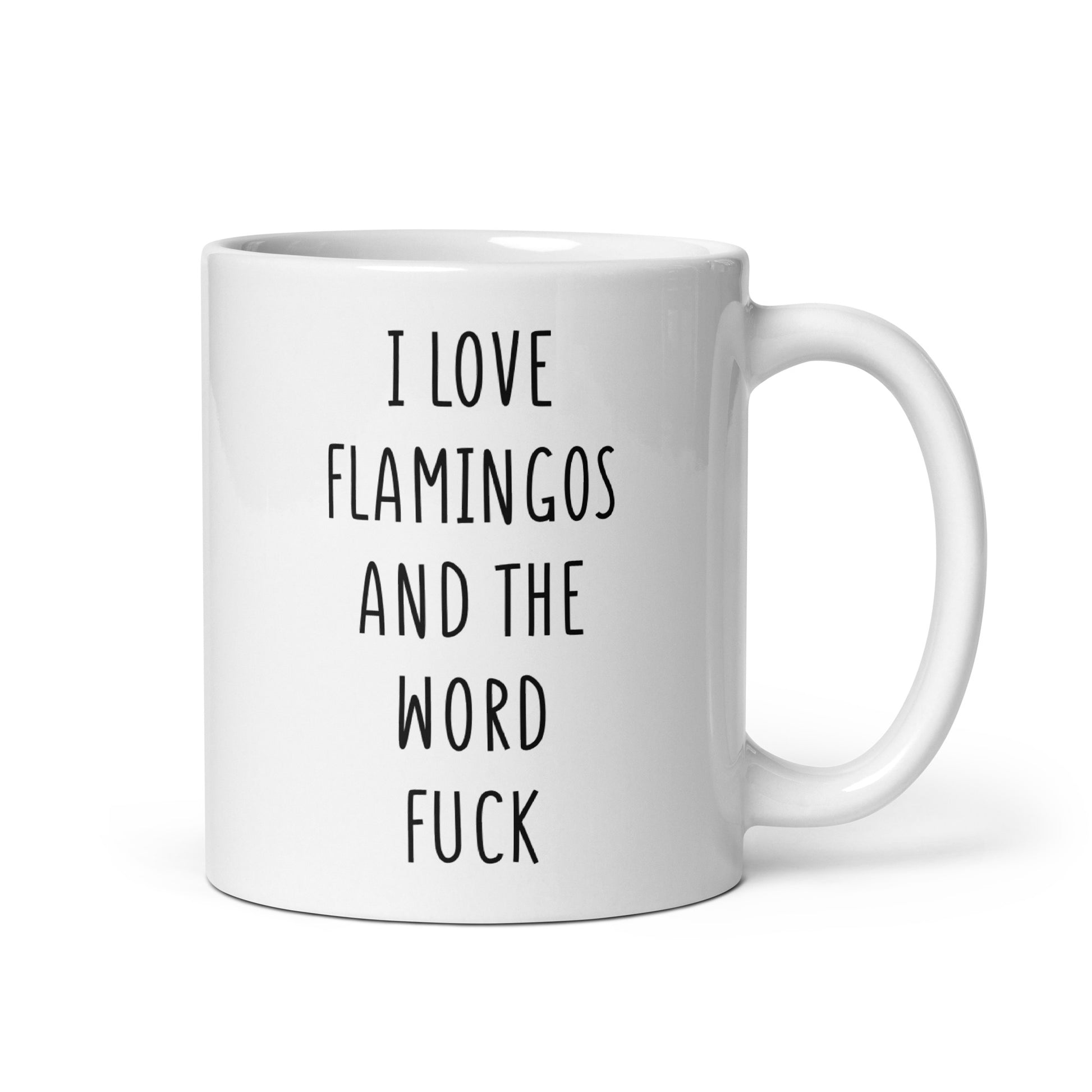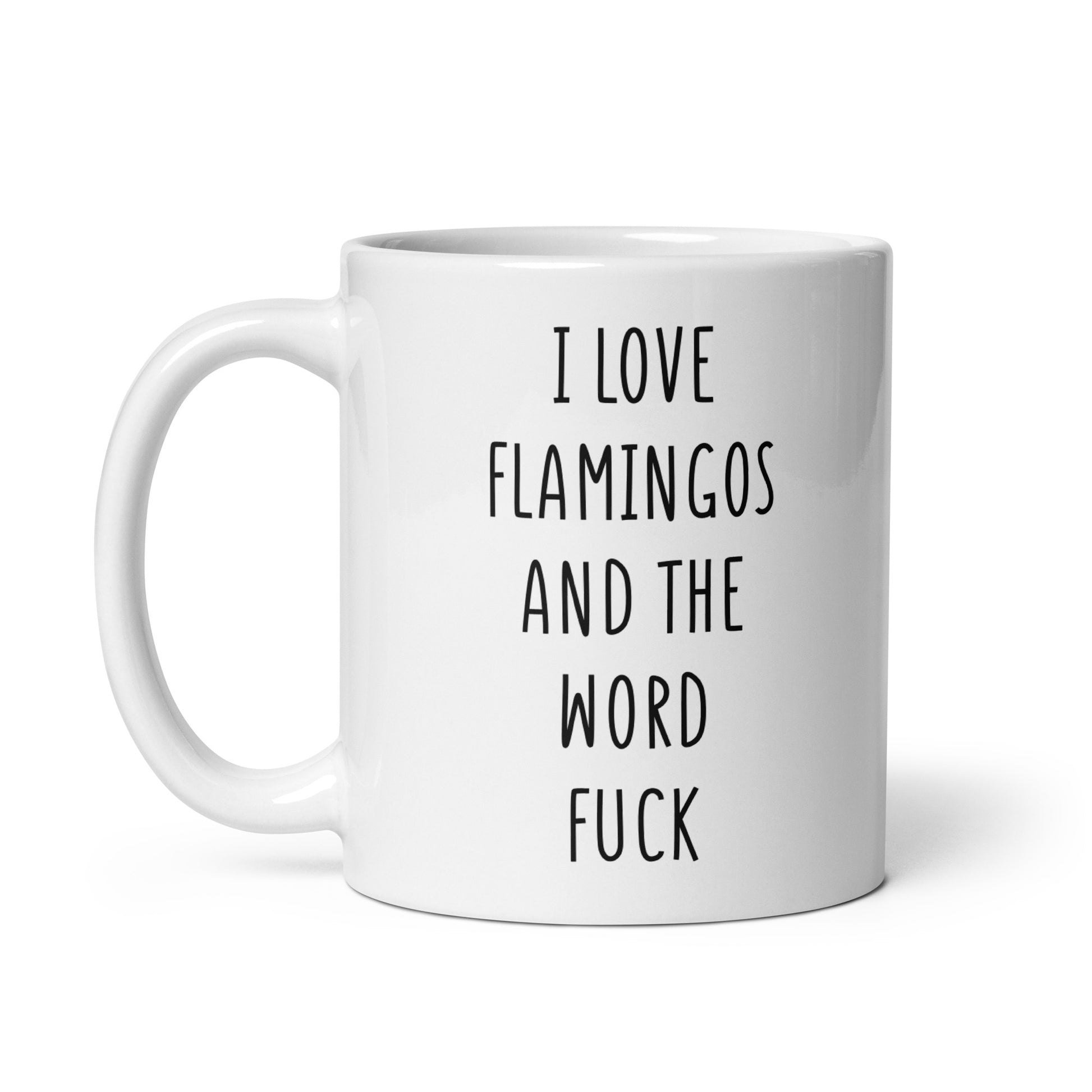 “I Love Flamingos And The Word Fuck" coffee mug in white.