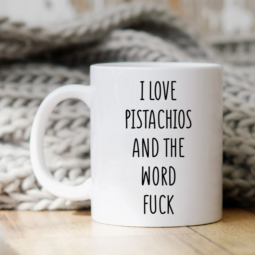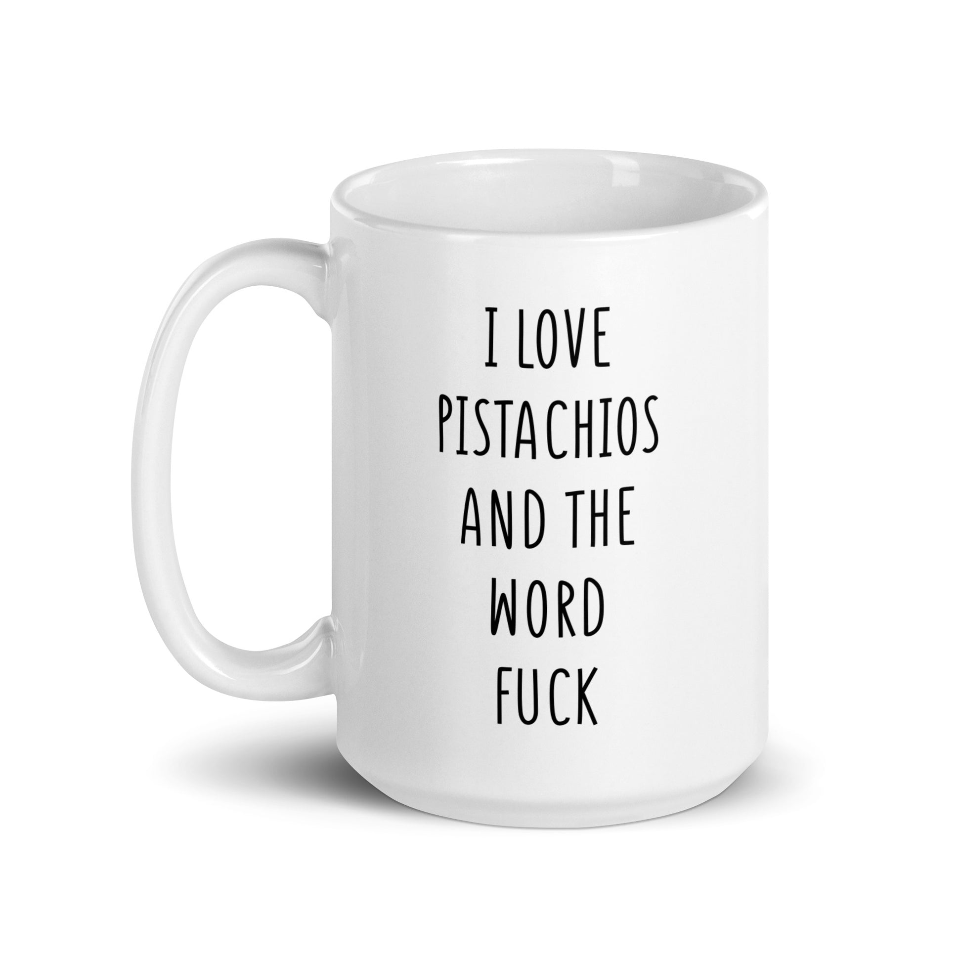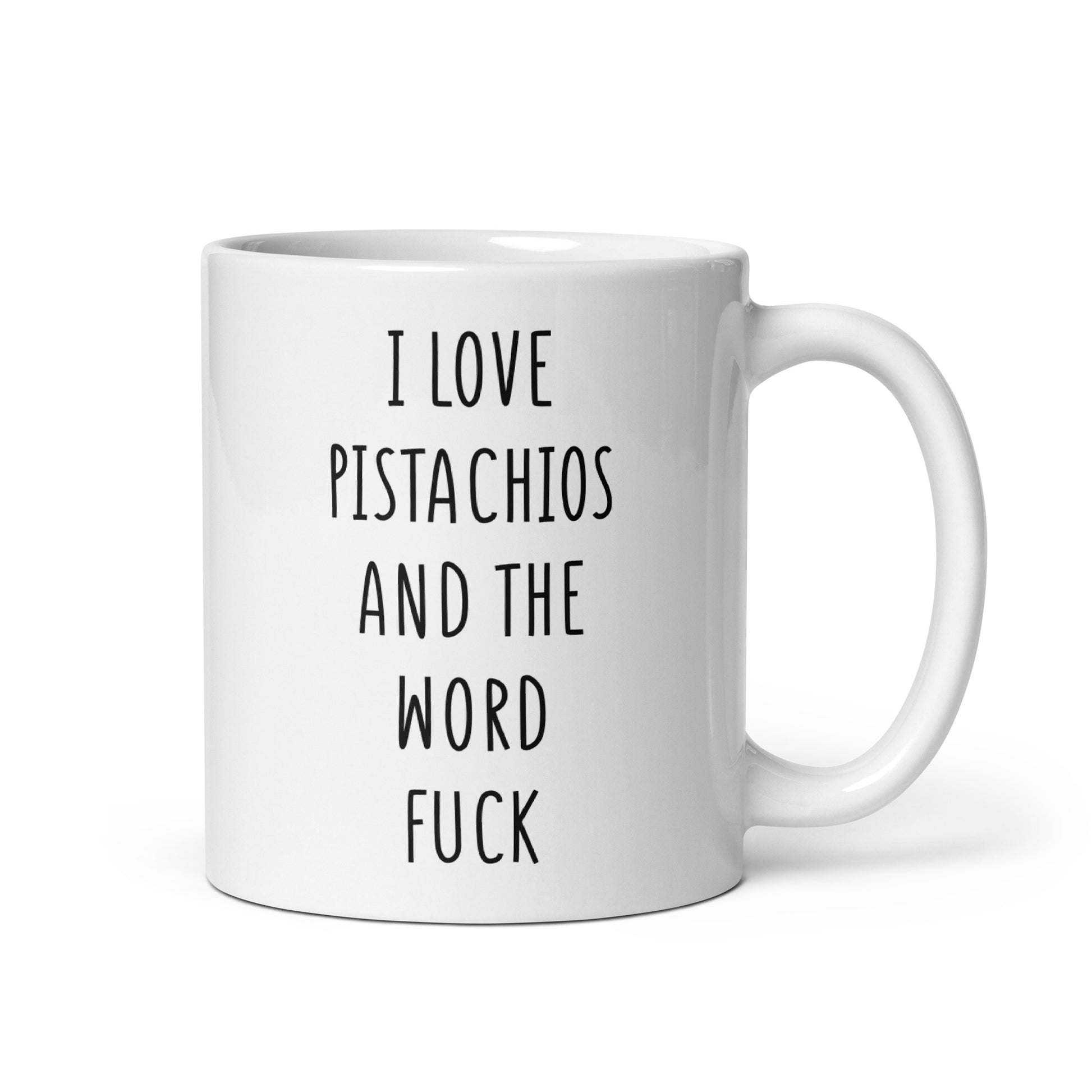 “I Love Pistachios And The Word Fuck" coffee mug in white.