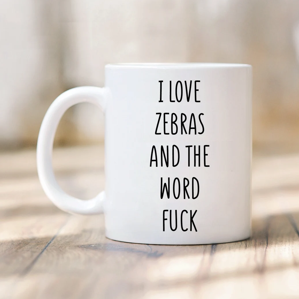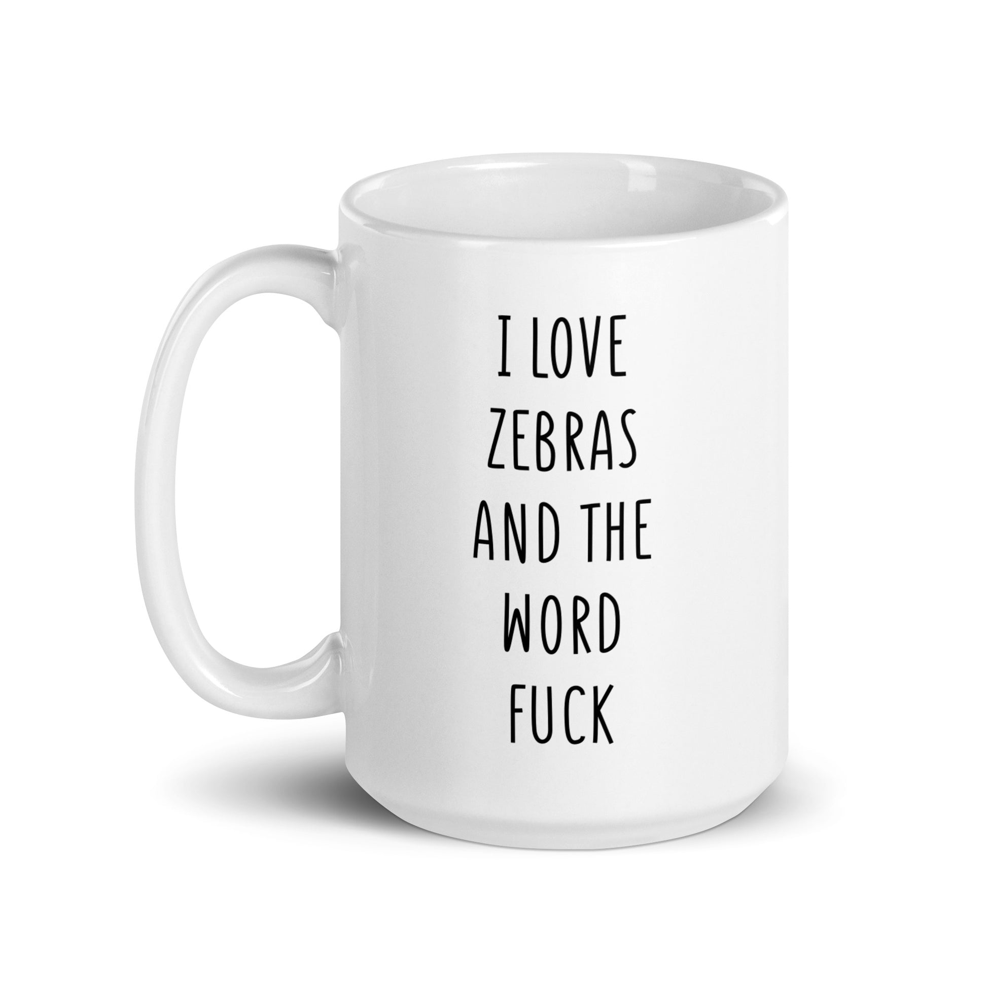 “I Love Zebras And The Word Fuck" coffee mug in white.