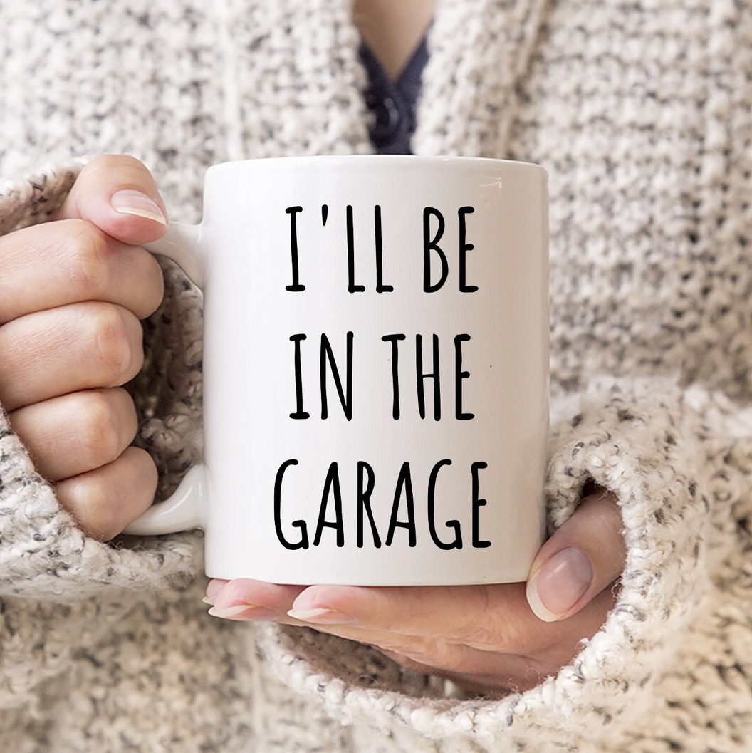 "I'll Be In The Garage" coffee mug in white.