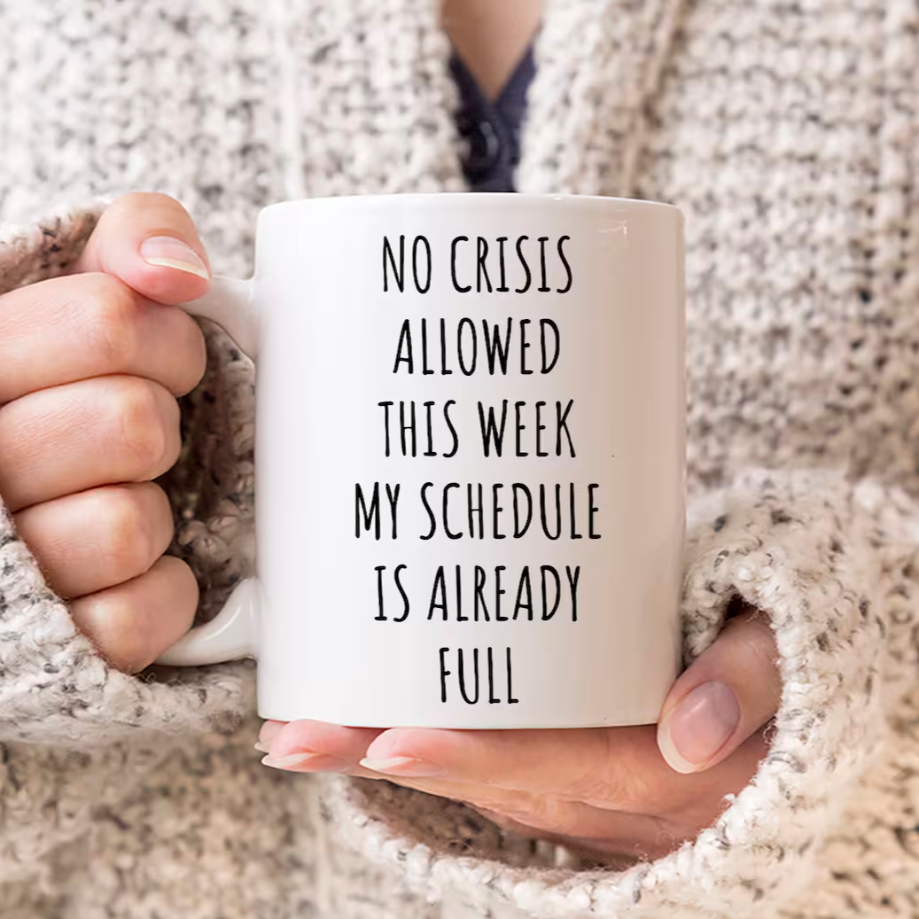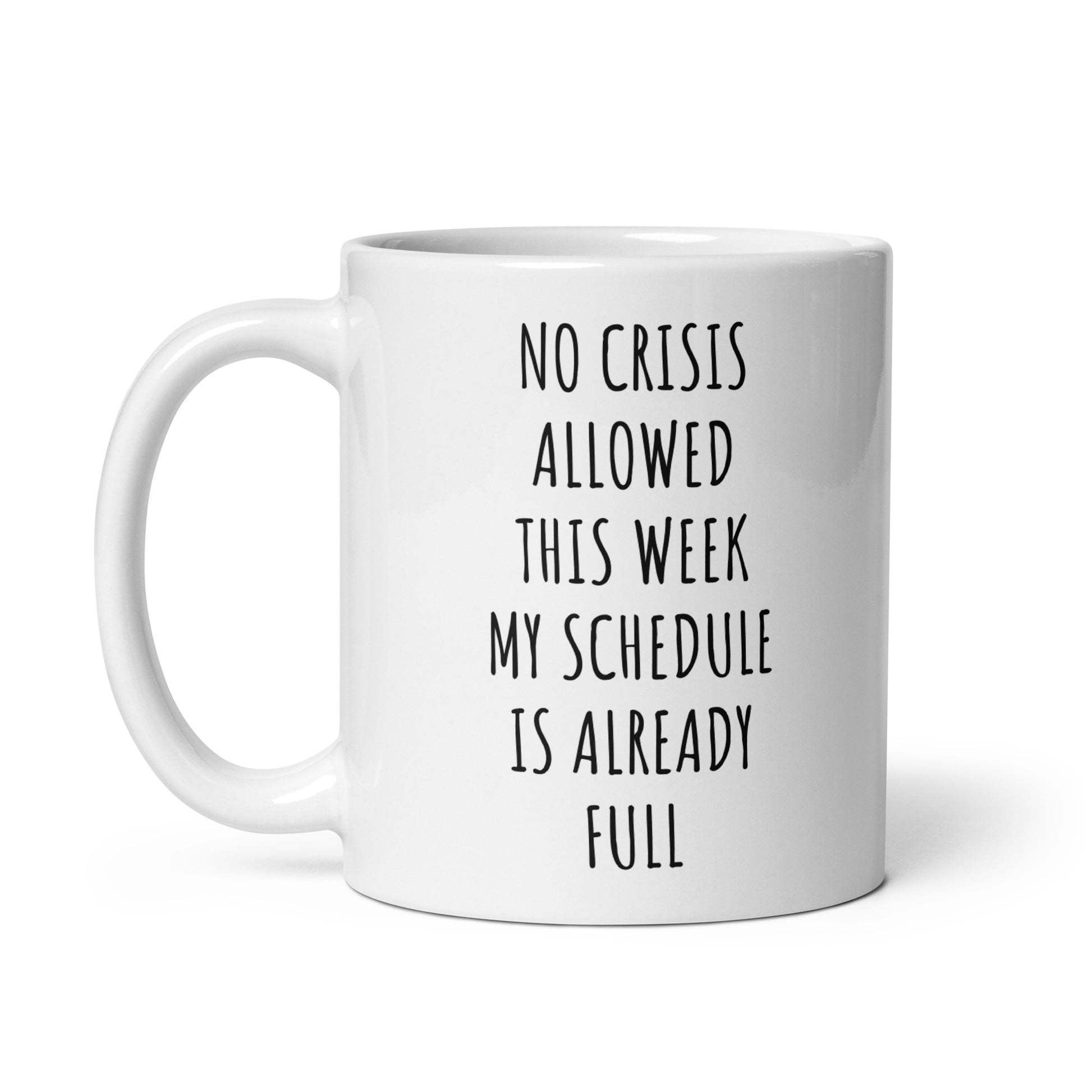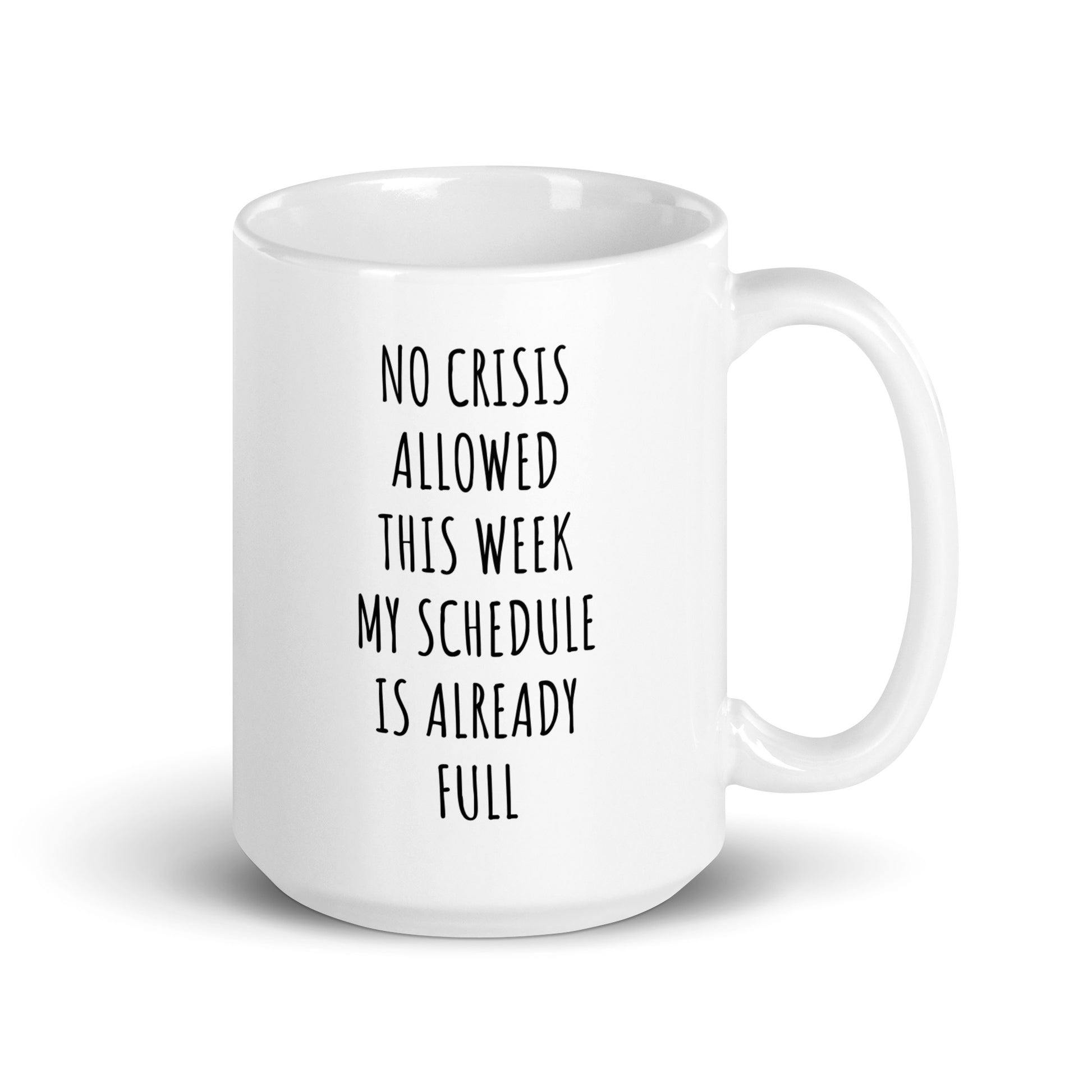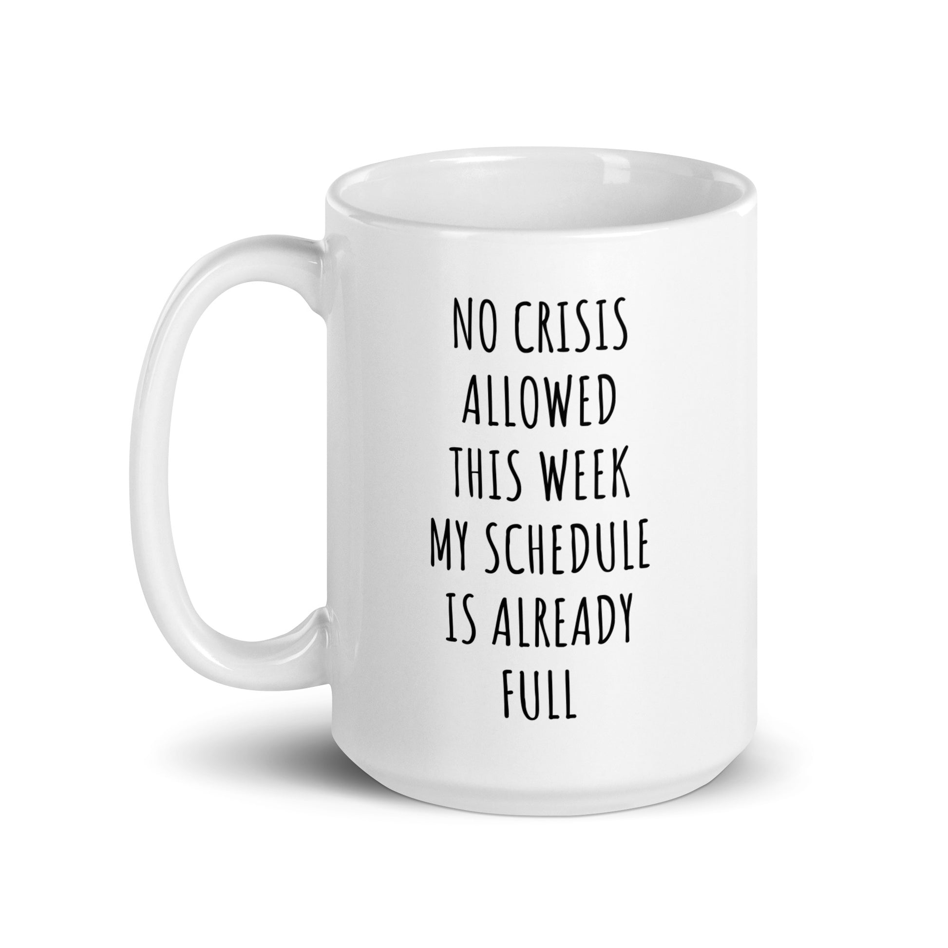 “No Crisis Allowed This Week My Schedule Is Already Full" coffee mug in white.