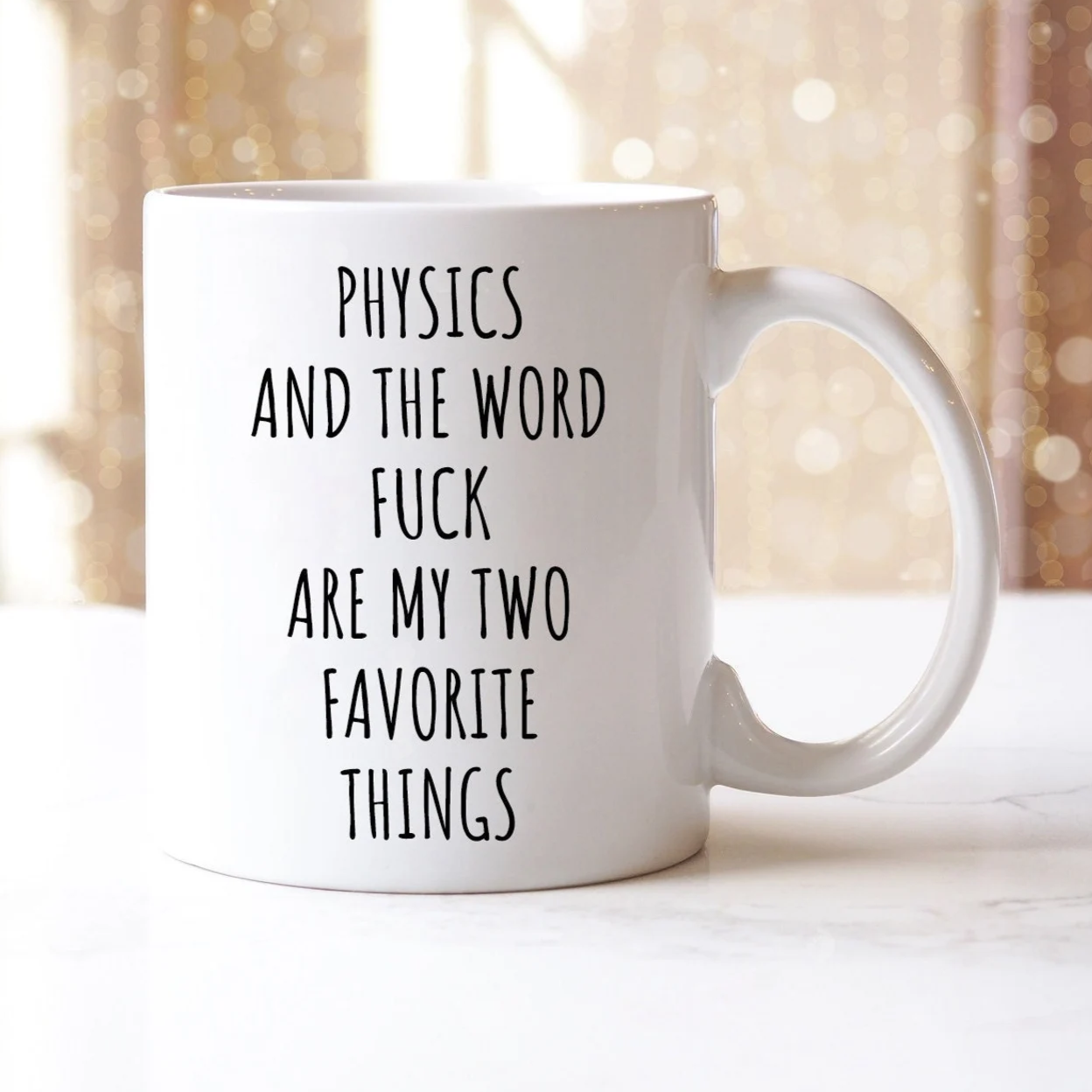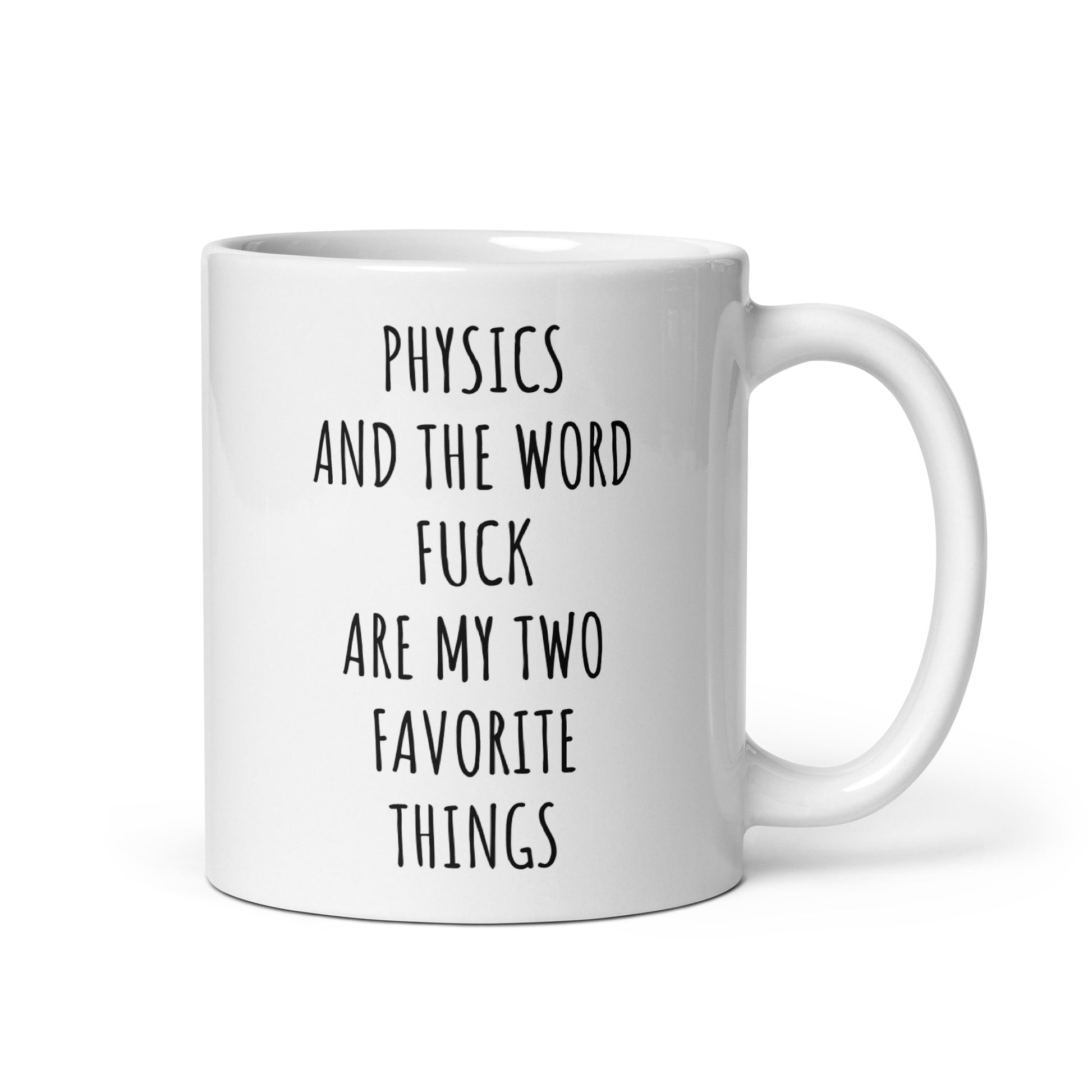 “Physics And The Word Fuck Are My Two Favorite Things" coffee mug in white.