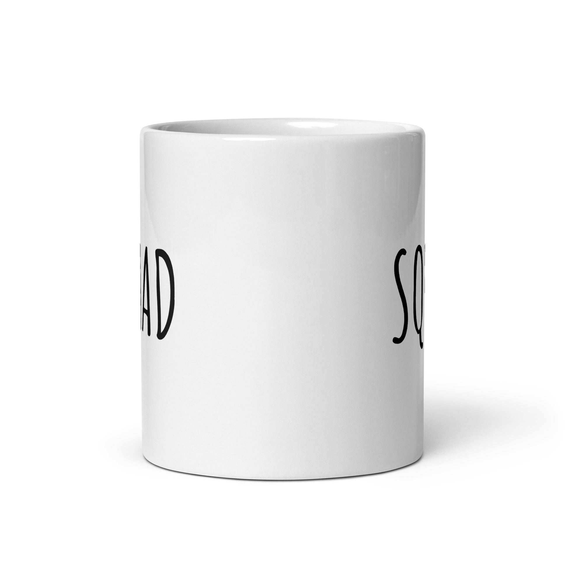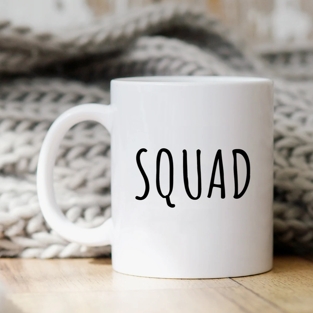 “SQUAD" coffee mug in white.