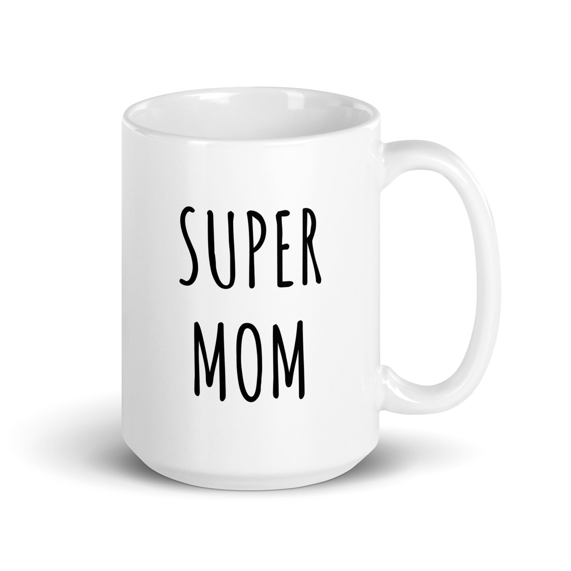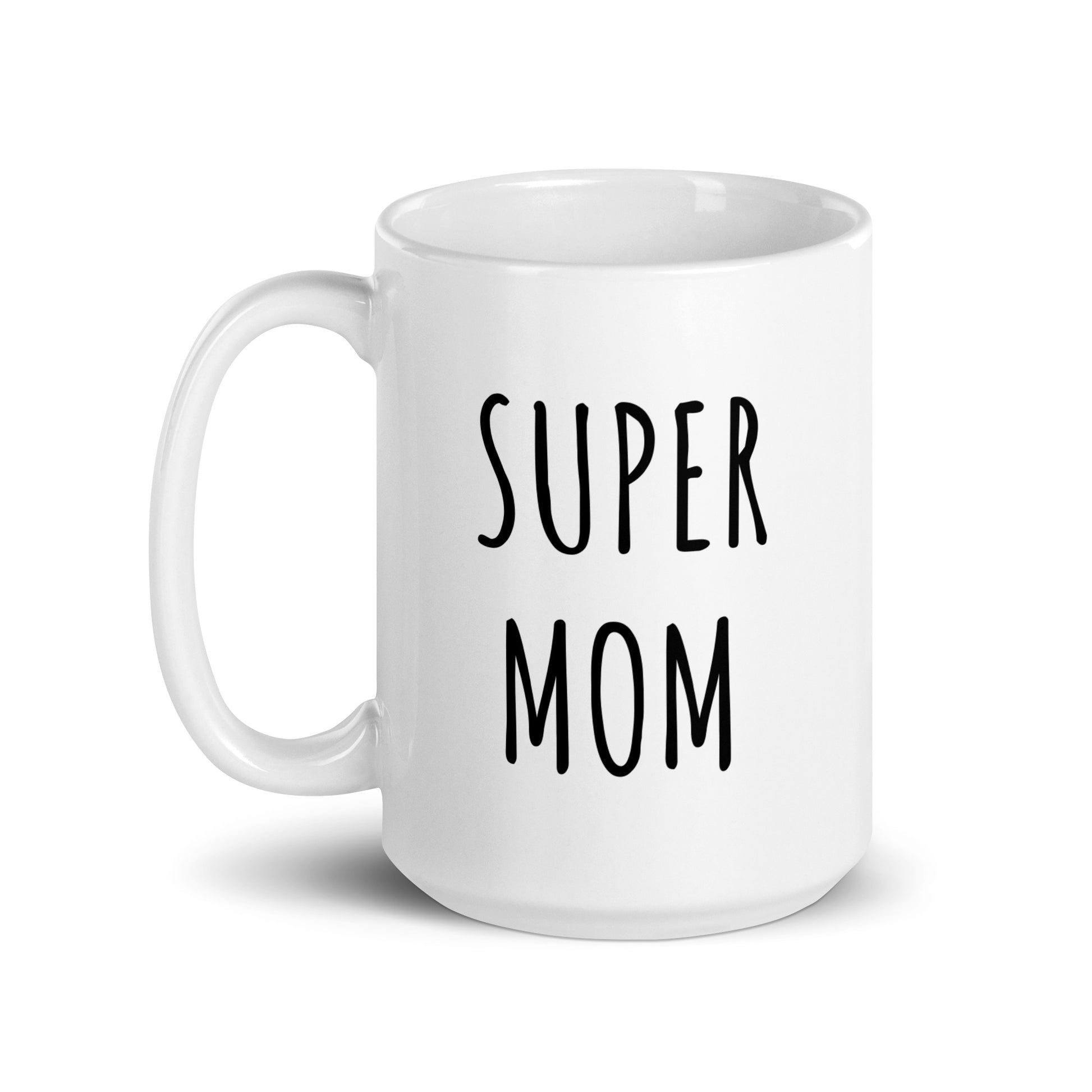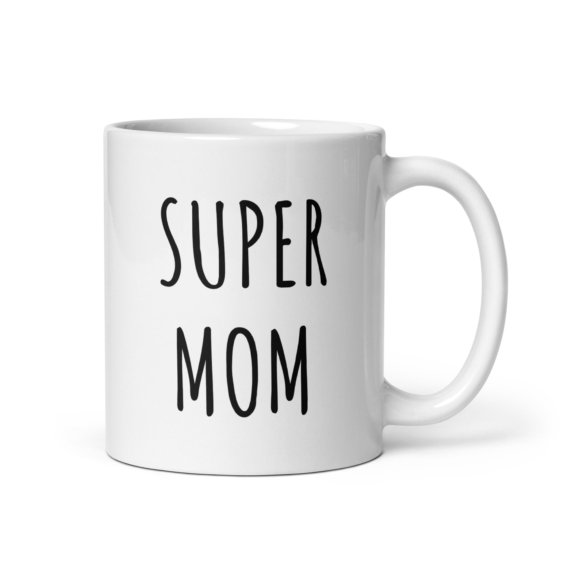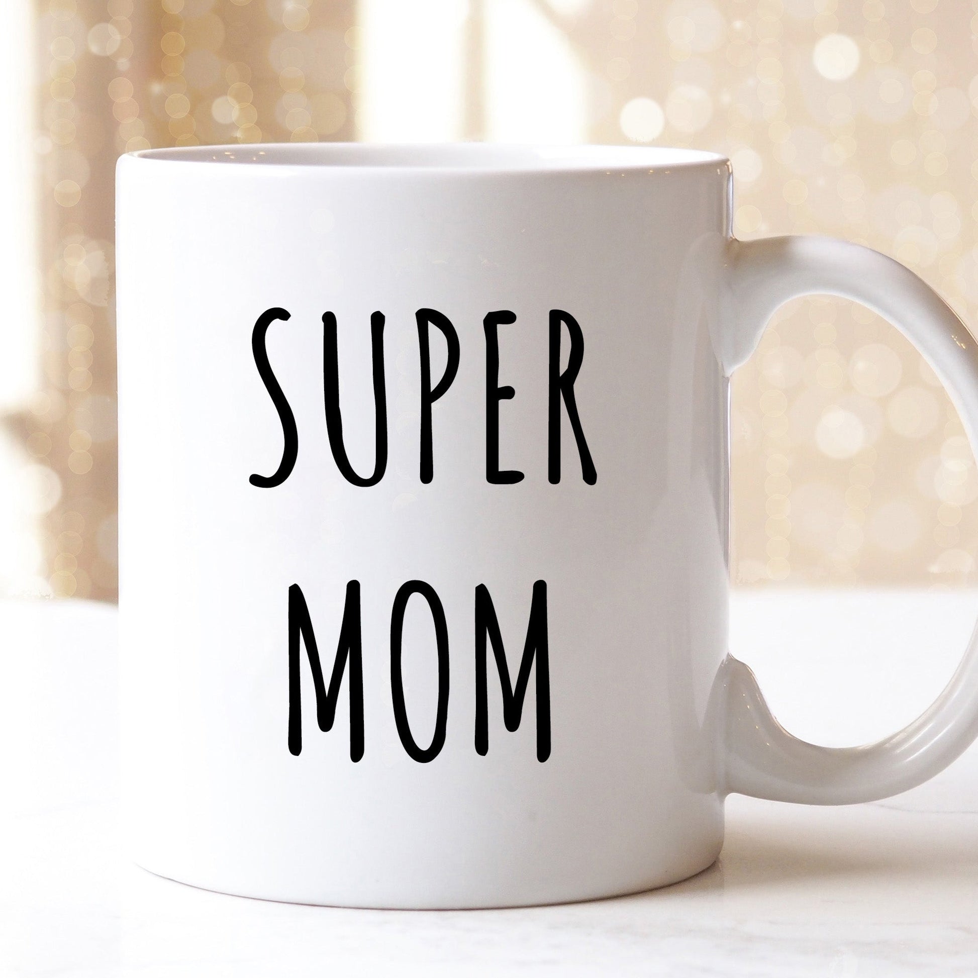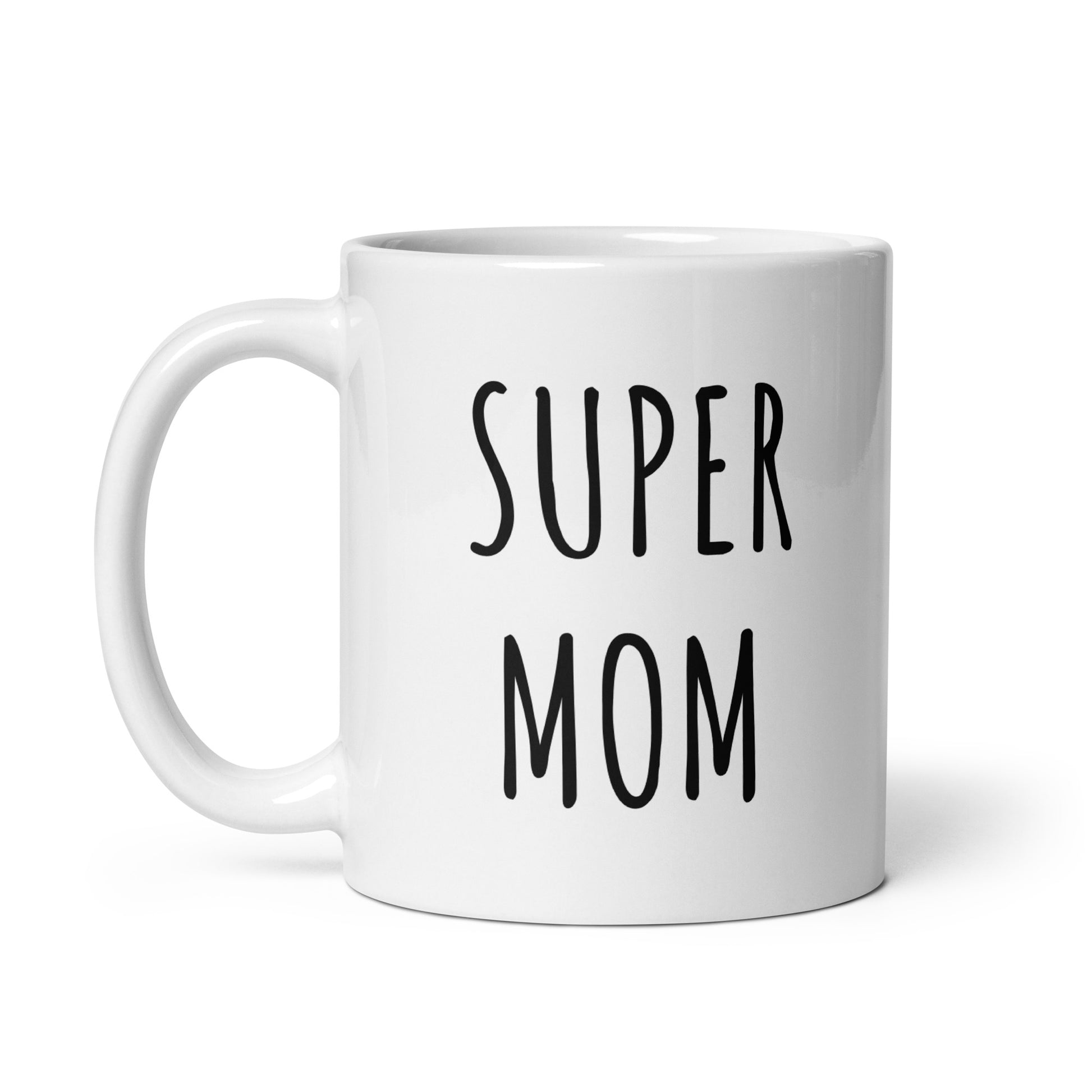 “Super Mom" coffee mug in white.