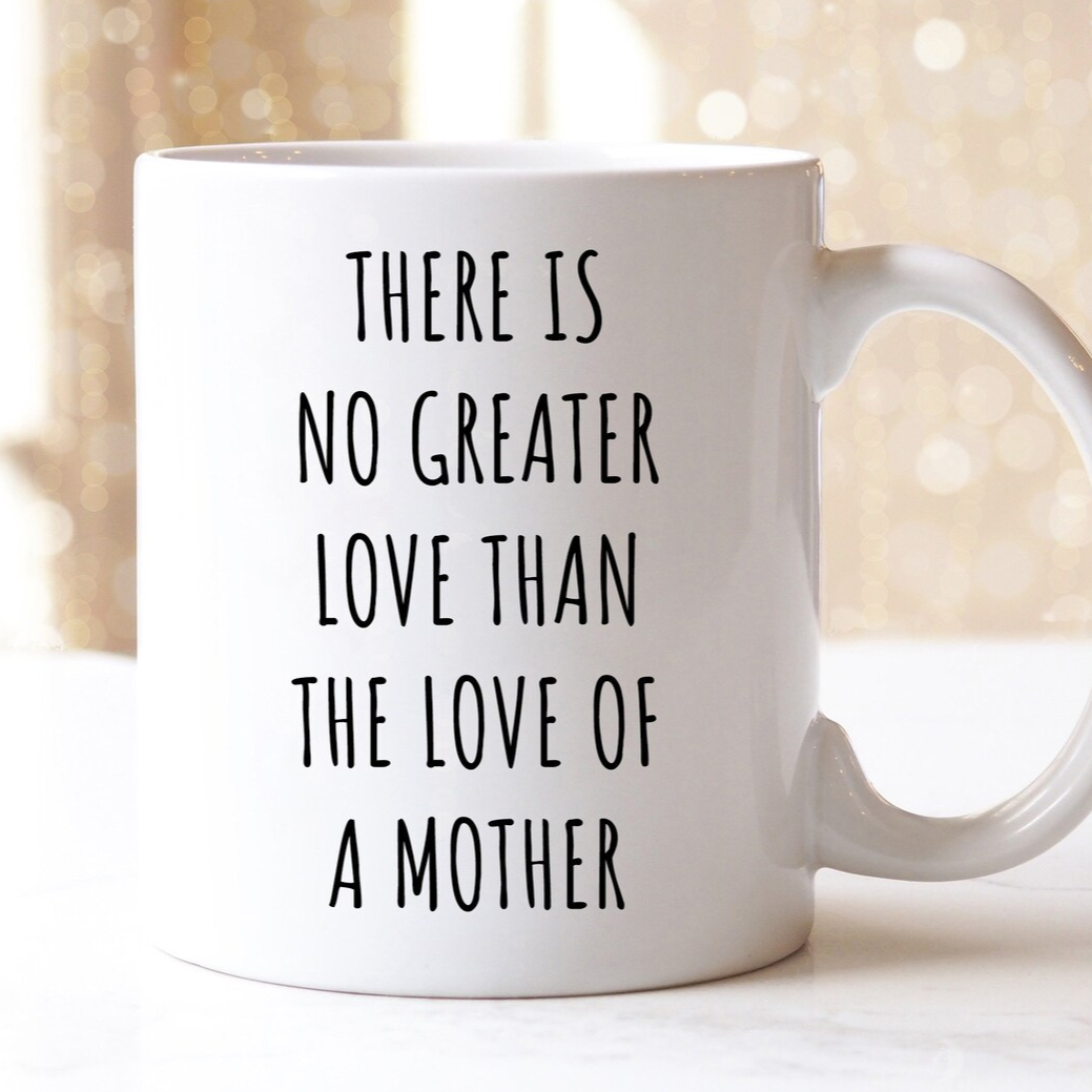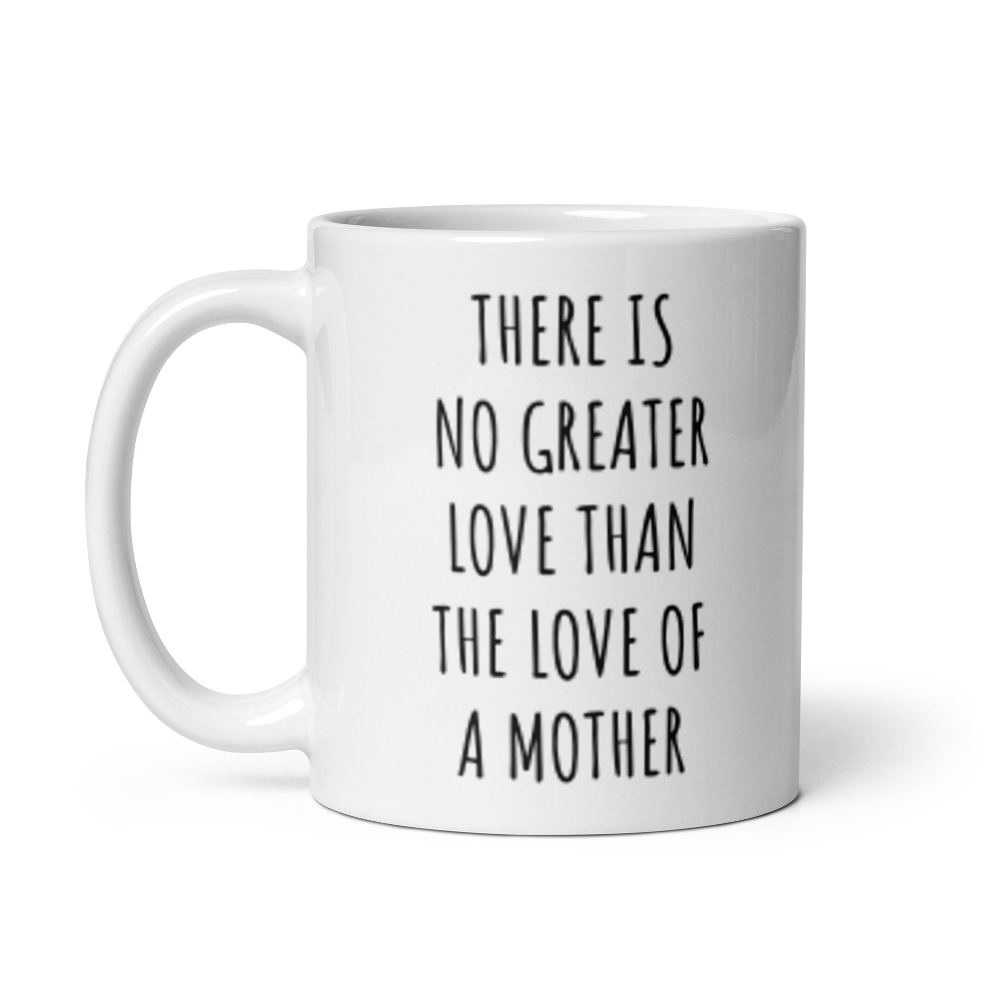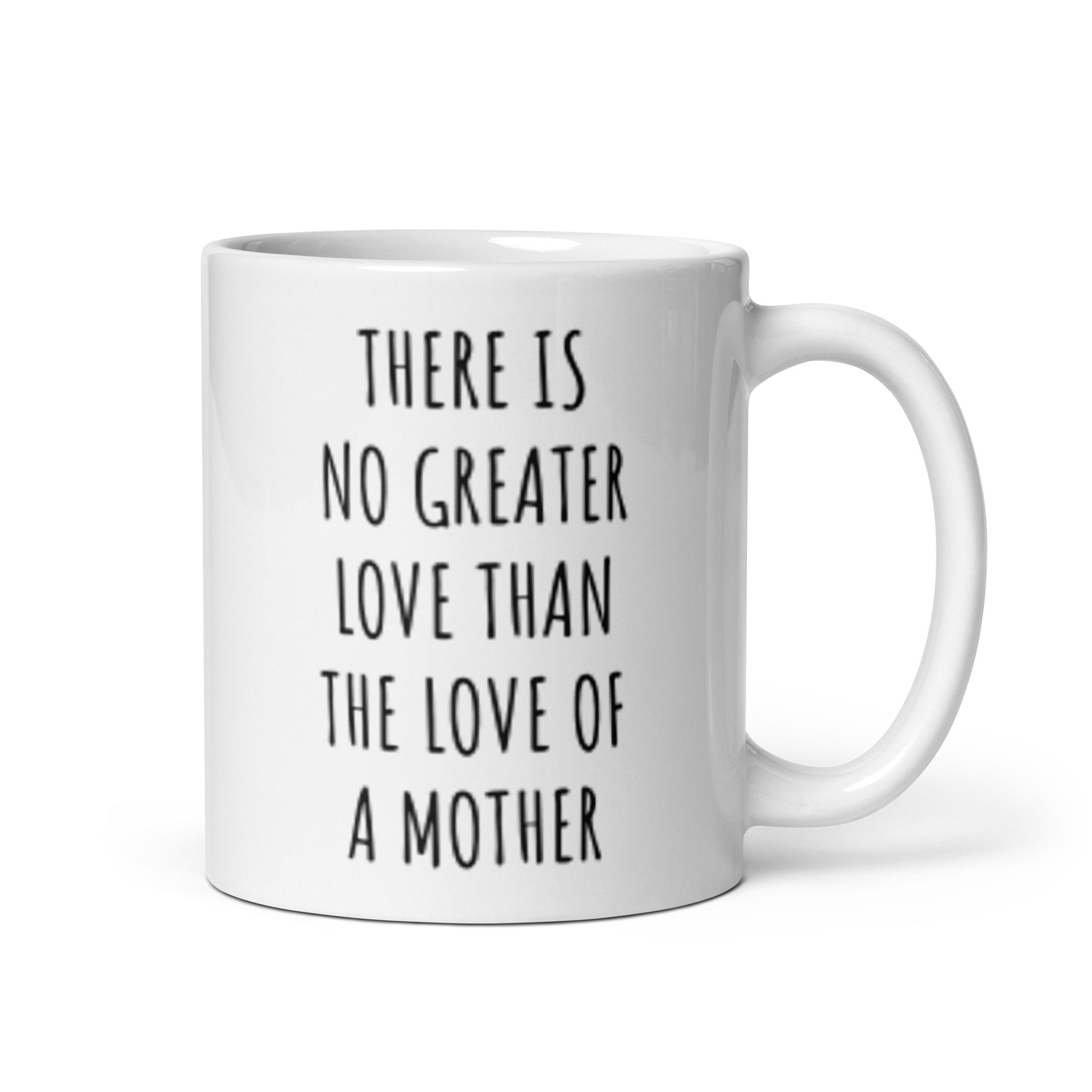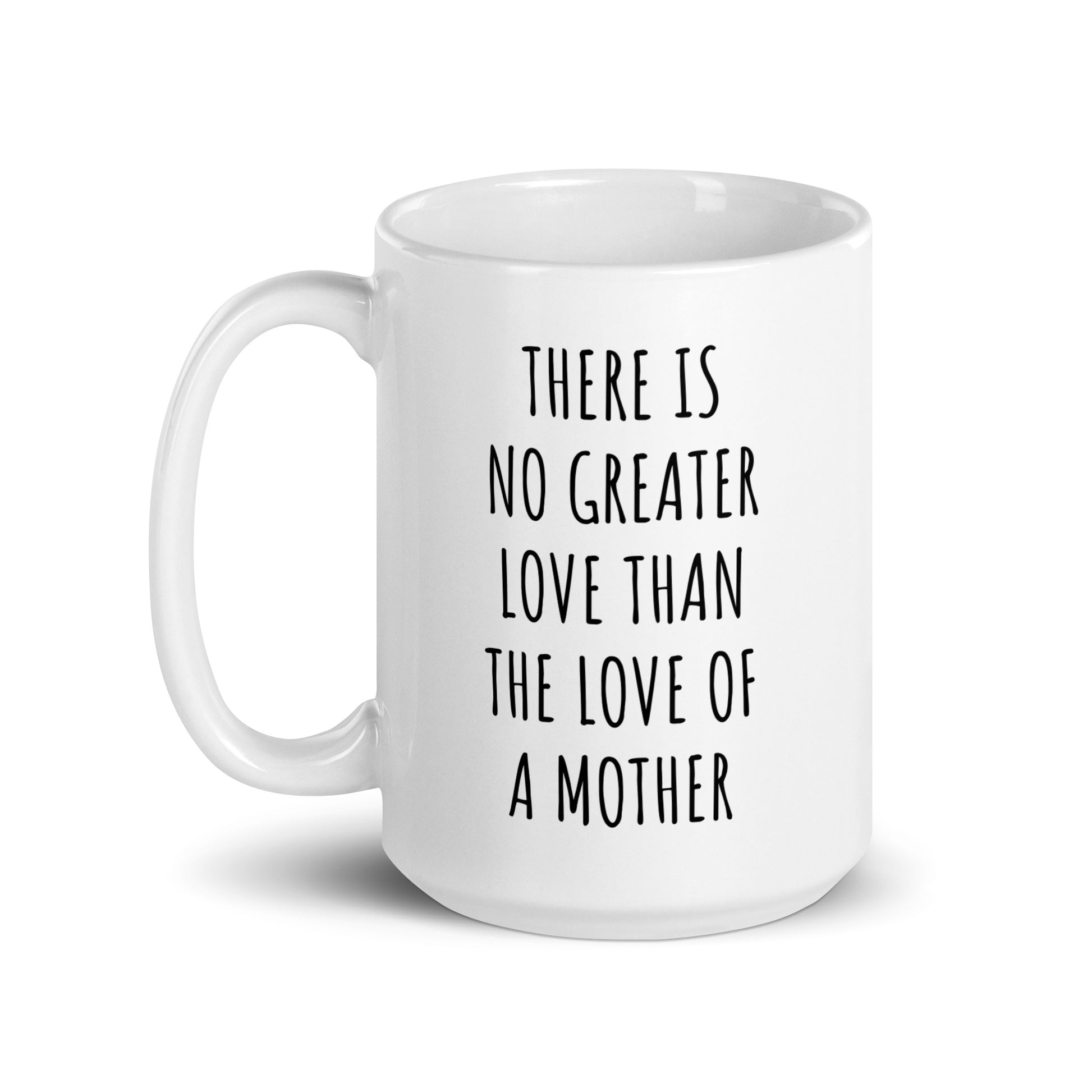 "There Is No Greater Love Than The Love Of A Mother" coffee mug in white.